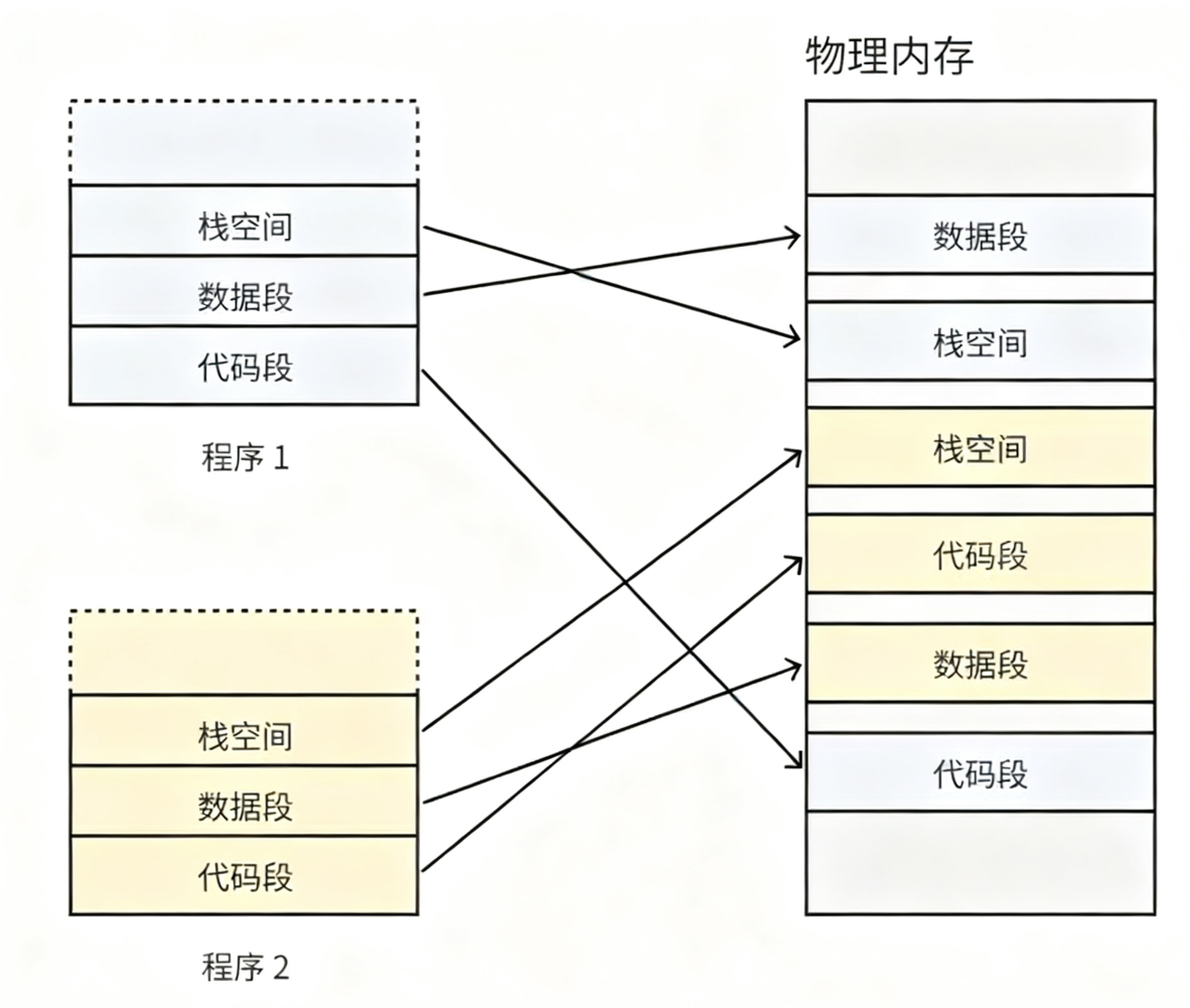 由于不同程序的代码和数据量各不相同,采用直接映射方式会导致物理内存被分割成大小不一的离散区块。随着程序运行一段时间后,部分程序退出会释放它们占用的内存空间,这些回收的内存会形成大量碎片。