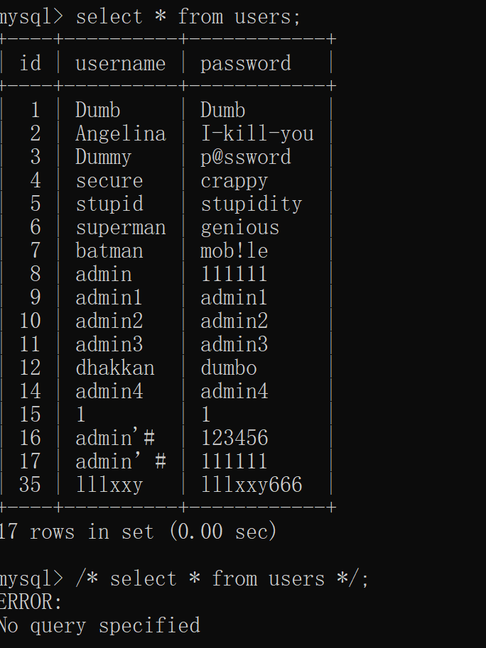 mysql> /* select * from users */;