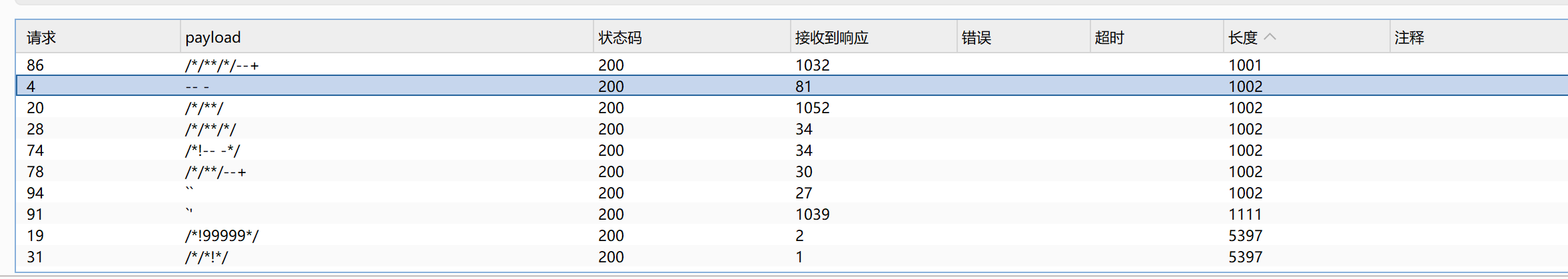 观察响应: 如果页面正常返回,可能支持堆叠 如果有语法错误但不同于普通注入错误,可能支持 如果有明显的延时,肯定支持