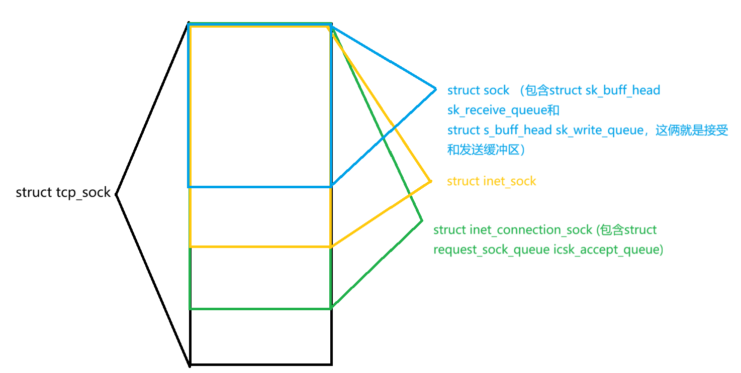 };TCP底层还是要创建一个struct tcp_sock,表示连接,这个就是在accept_queue排队的数据结构。