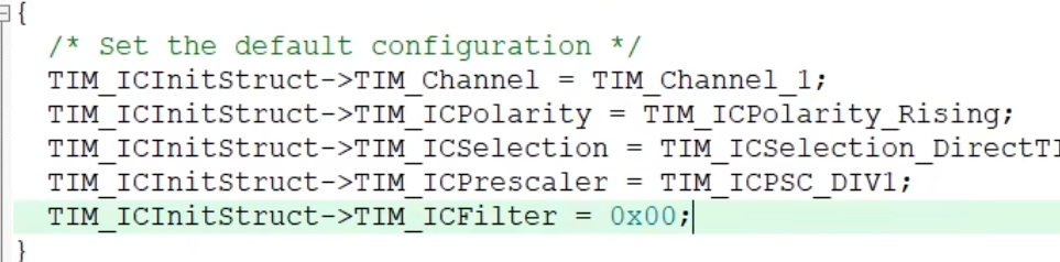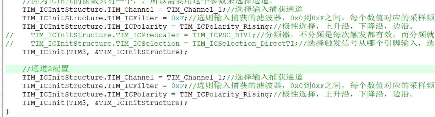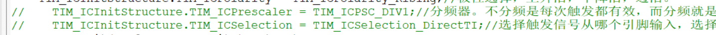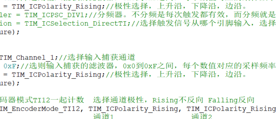 接下来是输入捕获部分,我们可以看到,输入捕获部分没有完全用到,编码器接口,只是用来通道1和通道2的滤波器以及边沿极性选择。所以我们只需要配置这两部分参数即可。