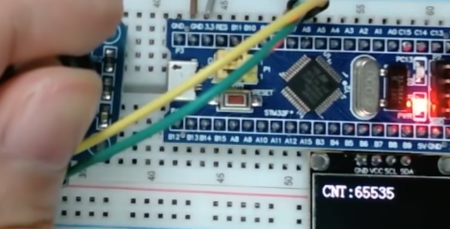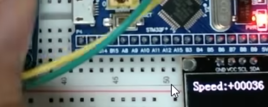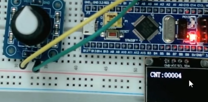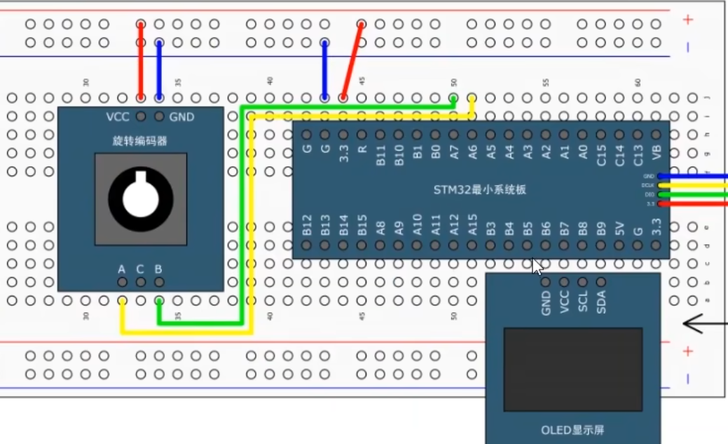 我们来看我们的接线图,这个接线图,和我们外部中断那个接线图类似,我们把旋转编码器插在面板版左面,VCC和GND接在电源正负极,下面的A相输出,我们接在PA6引脚,B相输出接在PA7引脚。这里的PA6和PA7引脚可以交换一下,都是可以的就是正传和反转的极性不同。
