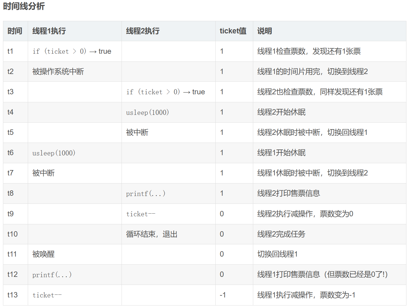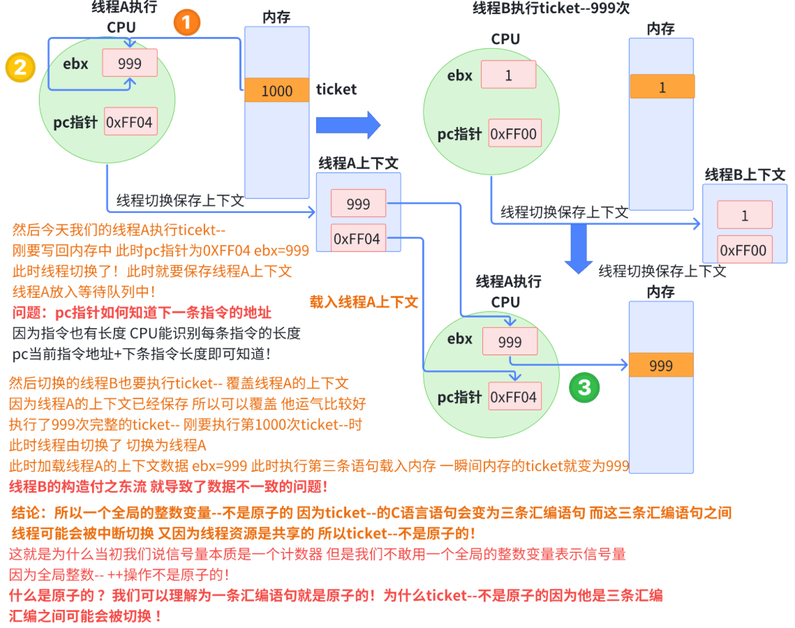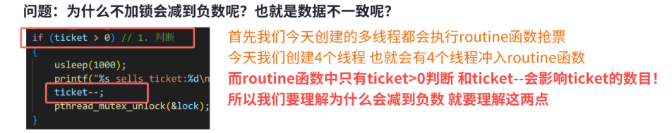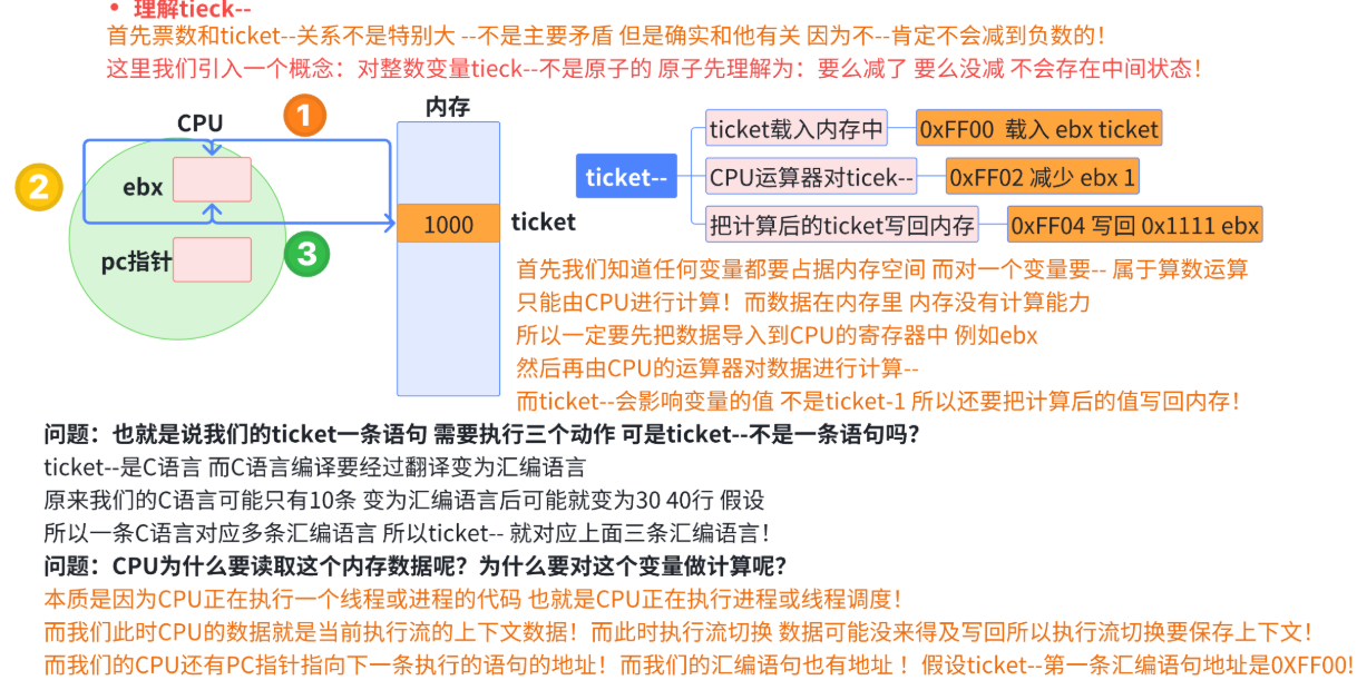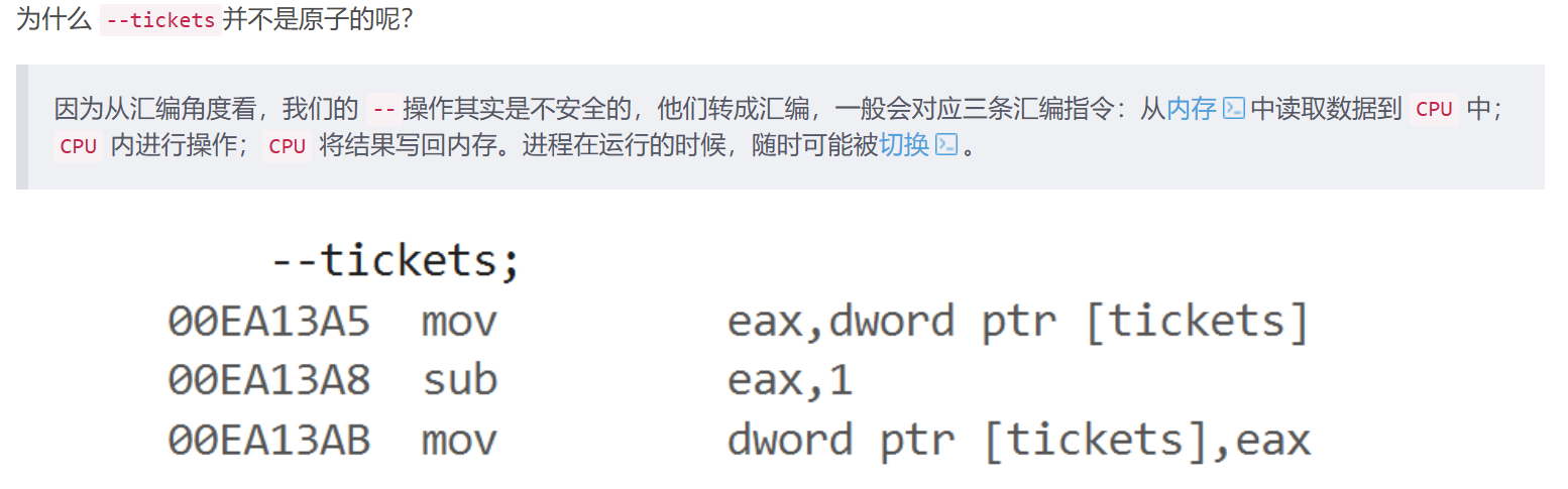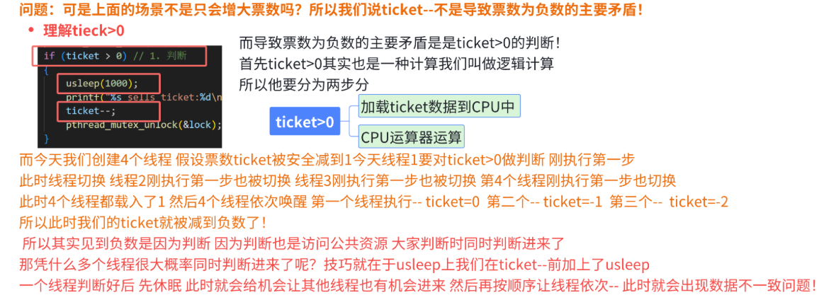 # 剩余票数出现负数,这明显不符合我们的常识与预期。之所以出现这种情况,本质就是 tickets 就是我们的临界资源,tickets-- 也并不是原子的,在多执行流同时执行时就可能会发生这种问题。