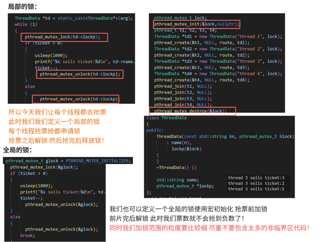 {pthread_mutex_init(&lock, nullptr); // 动态初始化pthread_t t1, t2, t3, t4;pthread_create(&t1, NULL, route, (void *)"thread 1");pthread_create(&t2, NULL, route, (void *)"thread 2");pthread_create(&t3, NULL, route, (void *)"thread 3");pthread_create(&t4, NULL, route, (void *)"thread 4");pthread_join(t1, NULL);pthread_join(t2, NULL);pthread_join(t3, NULL);pthread_join(t4, NULL);pthread_mutex_destroy(&lock); // 动态初始化需要显式销毁