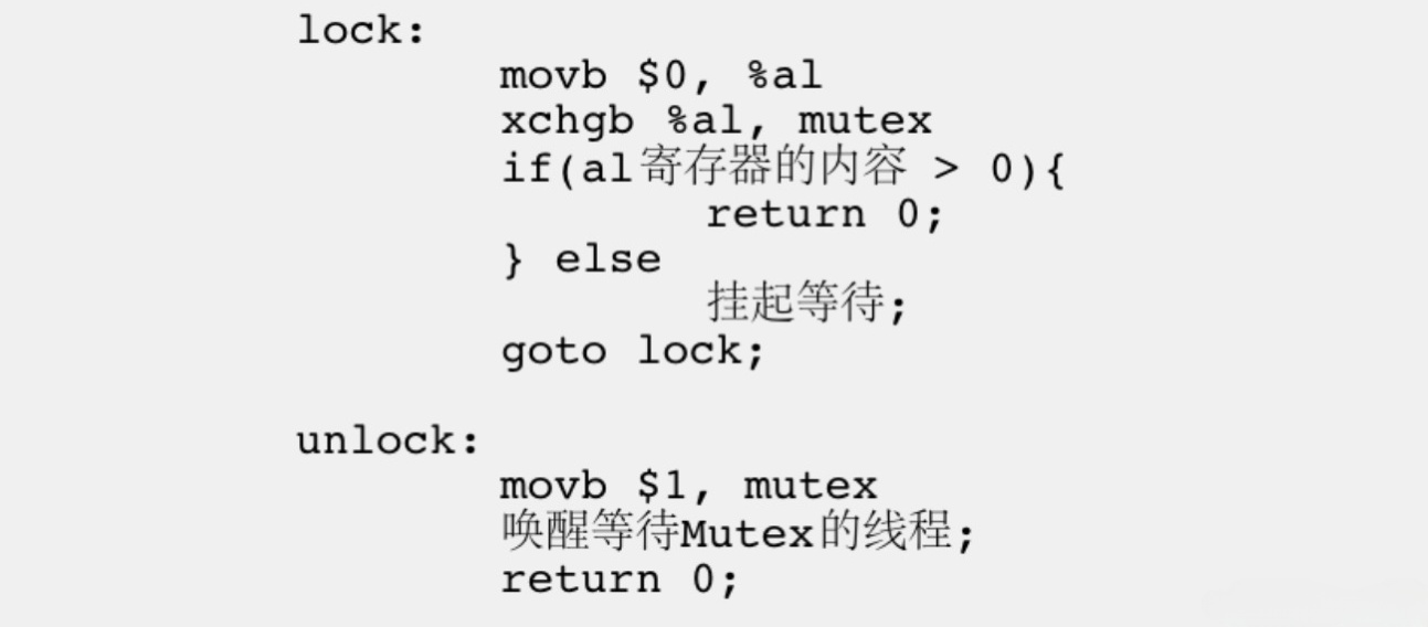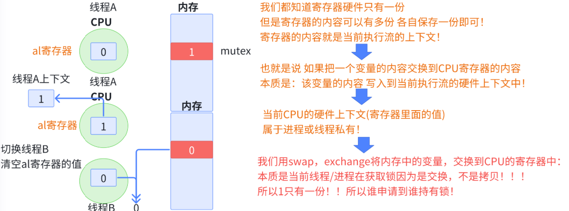 # 我们首先可以认为锁是一个标记位,例如一个整数1就是一个锁,我们让 mutex 的初始值为1,al 是计算机中的一个寄存器,当线程申请锁时,需要执行以下步骤: