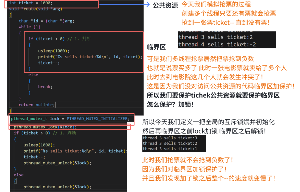 {char *id = (char *)arg;while (1){pthread_mutex_lock(&lock);if (ticket > 0){usleep(1000);printf("%s sells ticket:%d\n", id, ticket);ticket--;pthread_mutex_unlock(&lock);}else{pthread_mutex_unlock(&lock);break;}}return nullptr;