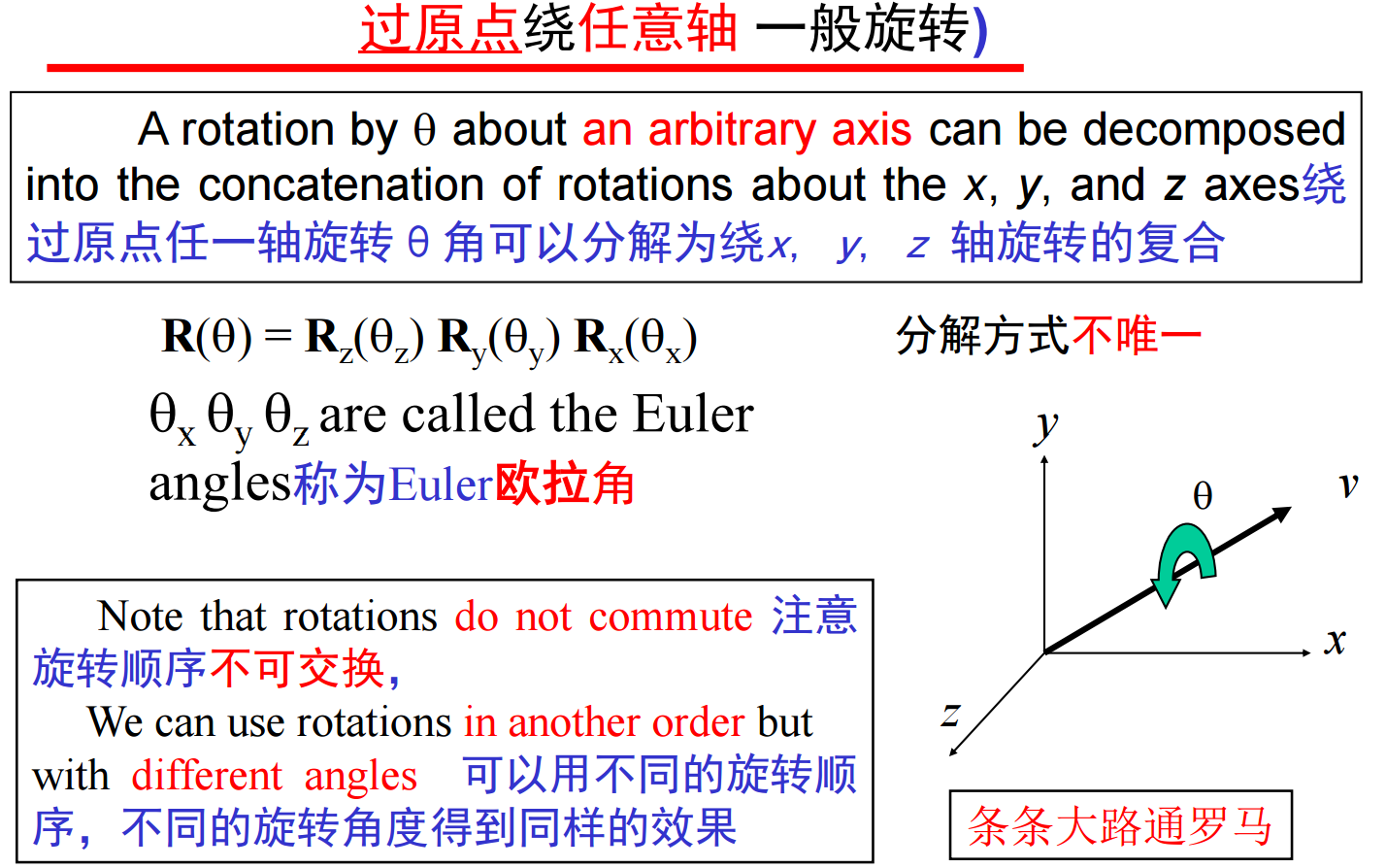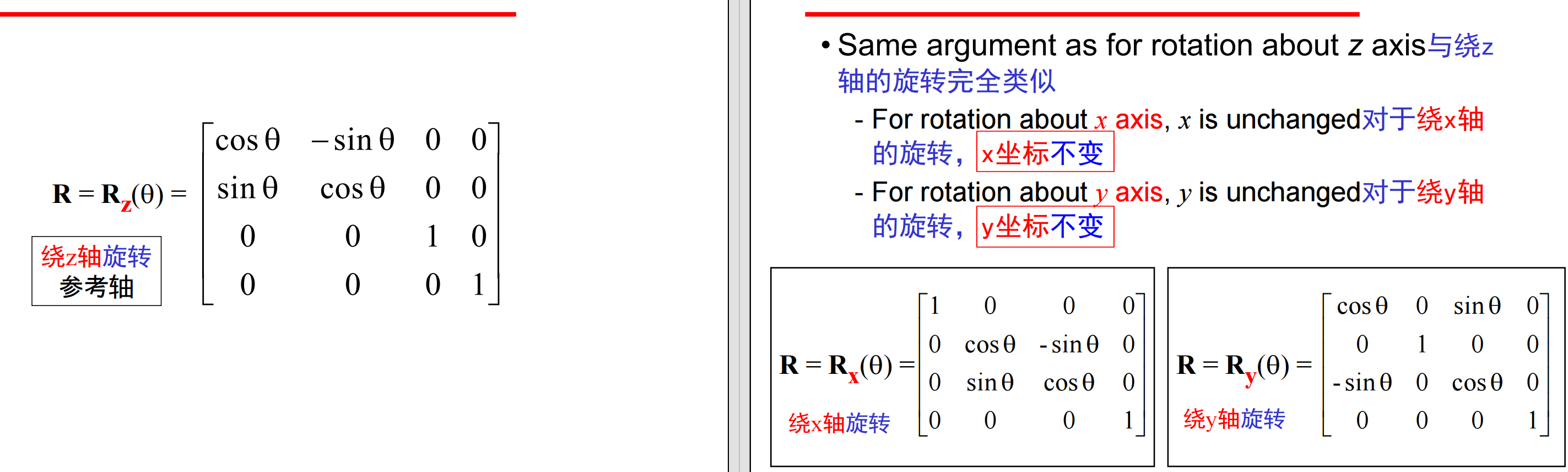 扩展到三维,考虑绕z轴旋转,点的z坐标不变,等价于在 z=常数的xy平面上进行二维旋转(x’=x cosθ –y sinθ、y’ = x sinθ + y cosθ、z’ =z),其齐次坐标表示为p’ = Rz (θ) p:
