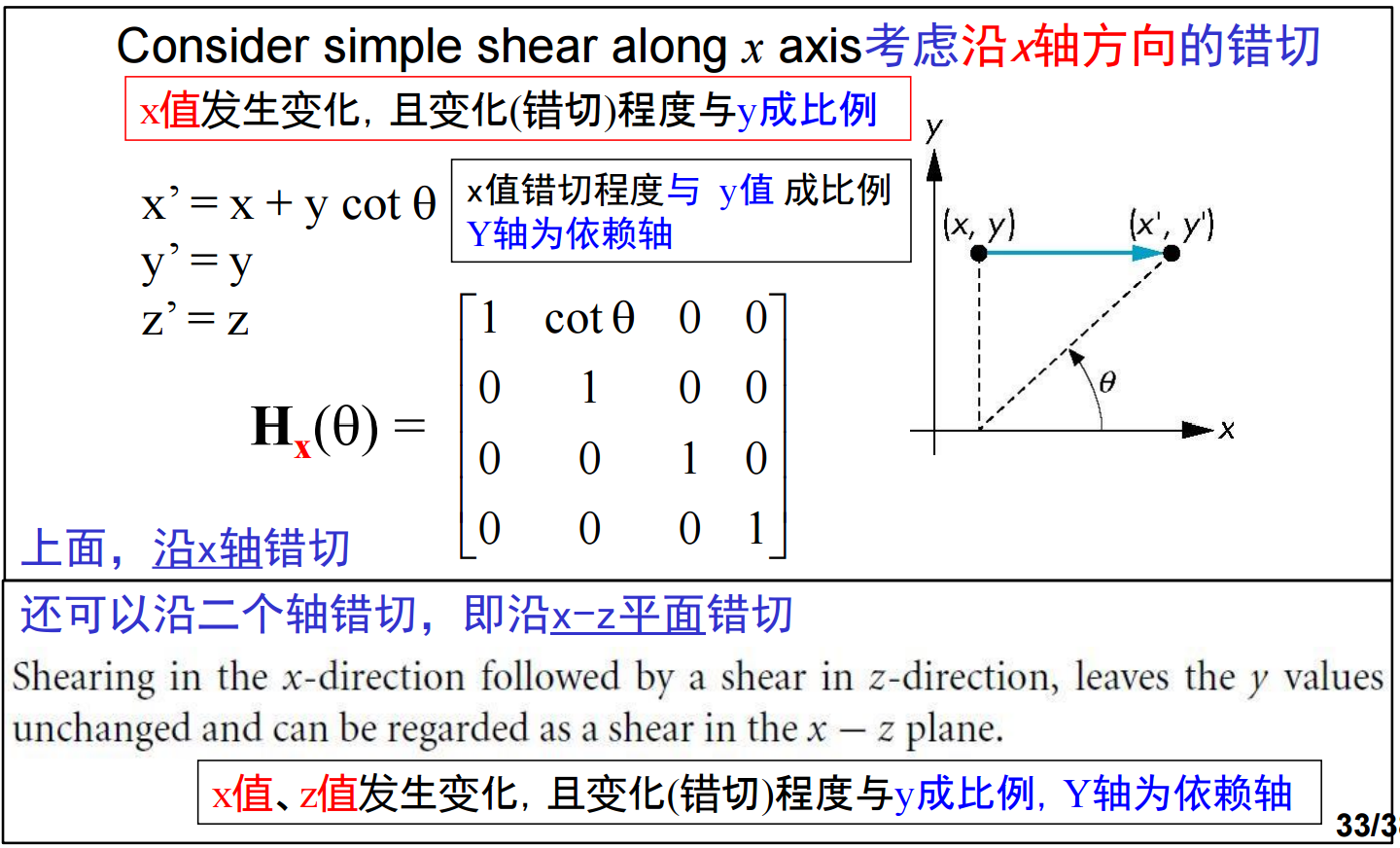 7、错切(Shear)是另外一种实用的基本变换,等价于把面向相反方向倾斜(可以想象成正方体的上平面被向右推,前侧面变成了平行四边形)。