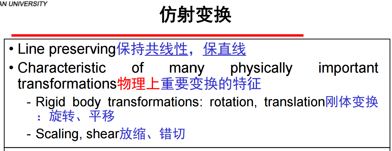 2、线性变换条件是f(αp+βq)=αf(p)+βf(q),满足可加性和齐次性,可以表示为矩阵相乘的形式v=AT u,具有二种形式(标架的变换,或顶点在同一个标架里的坐标变换)。而仿射变换(Affine Transformations)是具有线性不变性的变换,即先经系统再求和和先求和再经系统结果一样。