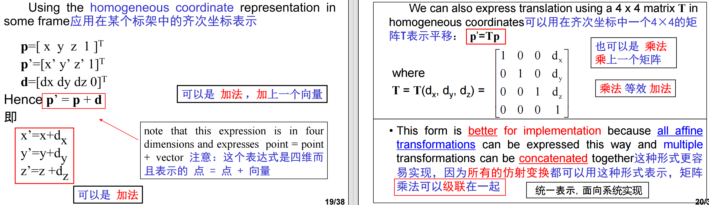 8、仿射变换:平移、旋转、放缩、剪切、反射。我们可以通过把旋转、平移与放缩矩阵相乘,从而形成任意的仿射变换。由于对许多顶点应用同样的变换,因此构造矩阵M = ABCD的代价相比于对许多顶点p计算Mp的代价是很小的,难点在于如何构造出满足要求的变换矩阵。在变换矩阵中,注意,在右边的矩阵是首先被应用的矩阵,不可交换!