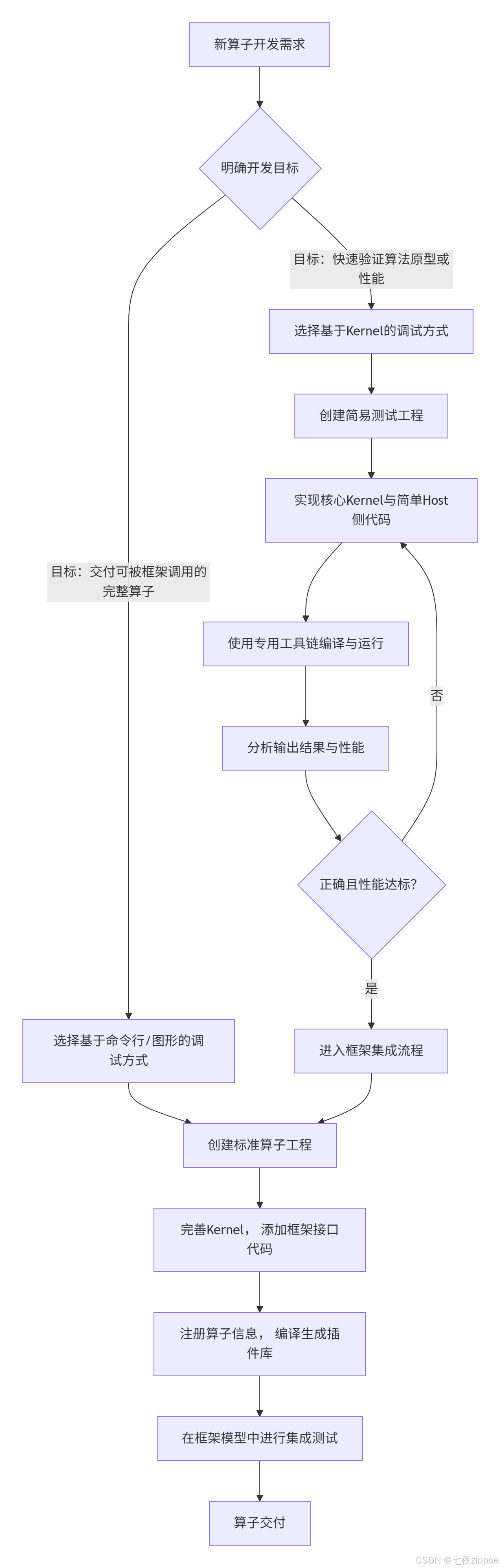 这种方式是面向生产的“标准流程”,旨在开发出能被 AI 框架直接调用的、功能完整的算子。它涵盖了从算子实现到框架集成的全过程。