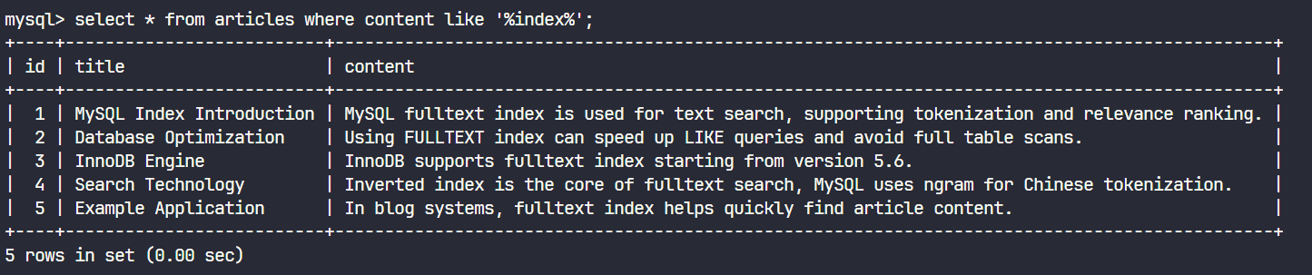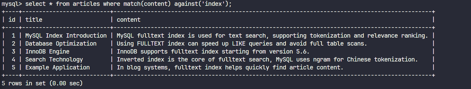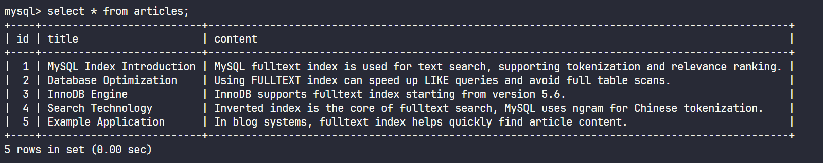 ('Example Application', 'In blog systems, fulltext index helps quickly find article content.');-- 添加全文索引(针对 content 字段)