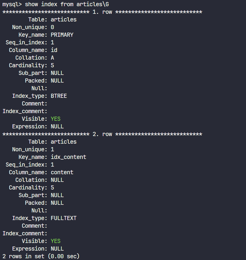 该表结构通过show index ... 查看对应的全文索引结果为: