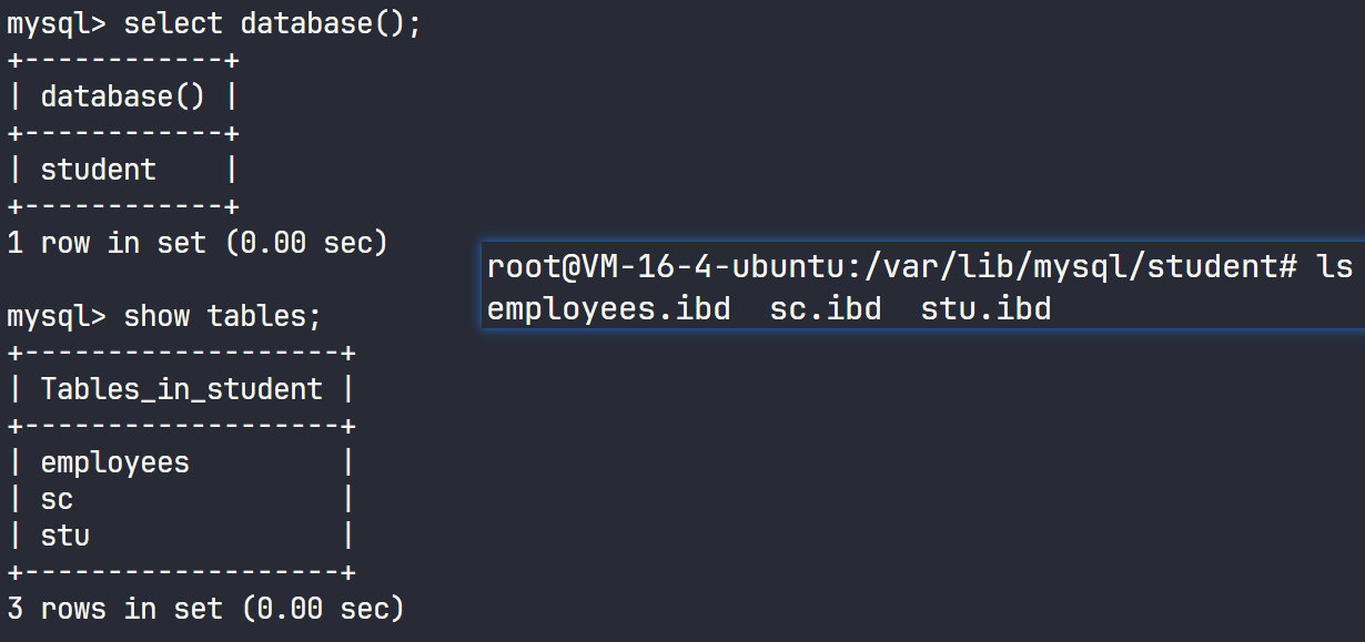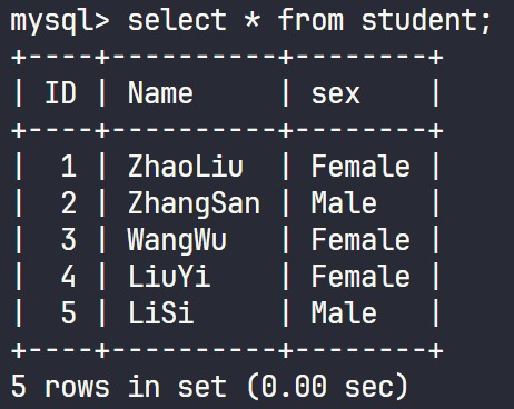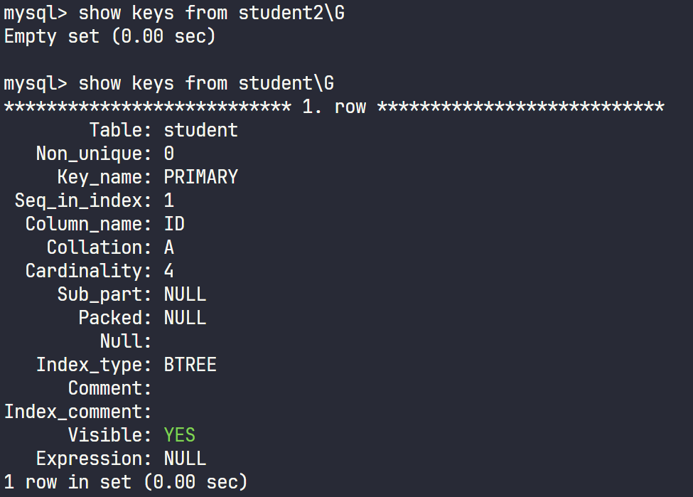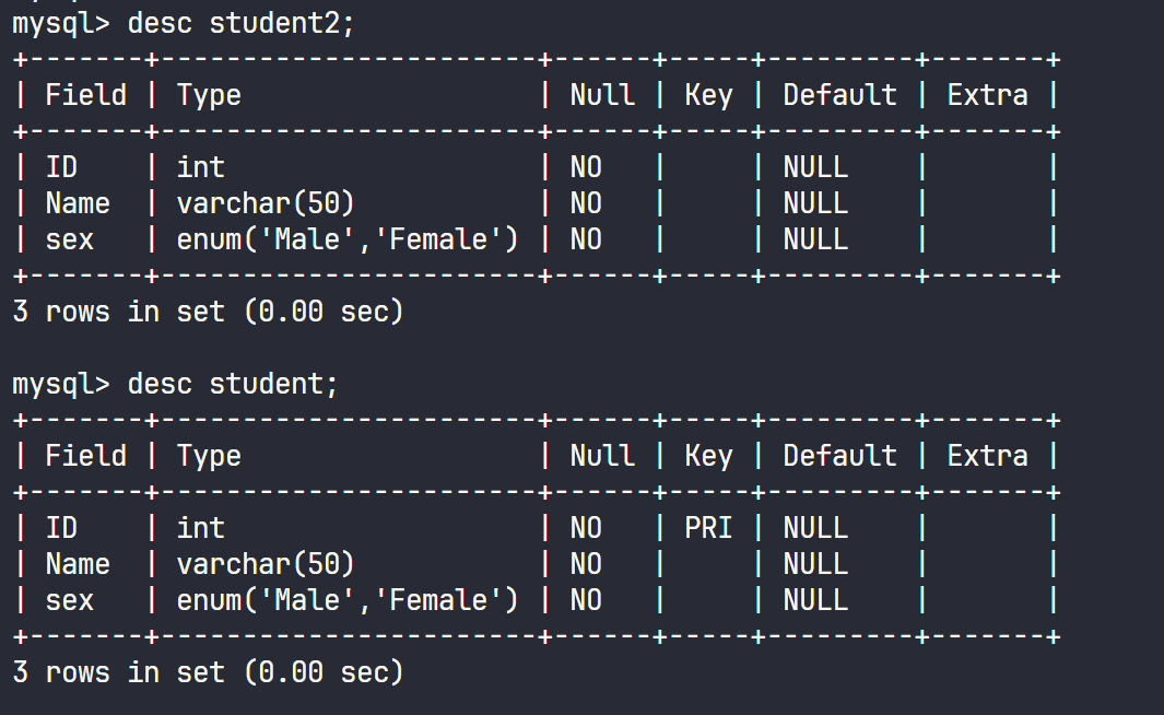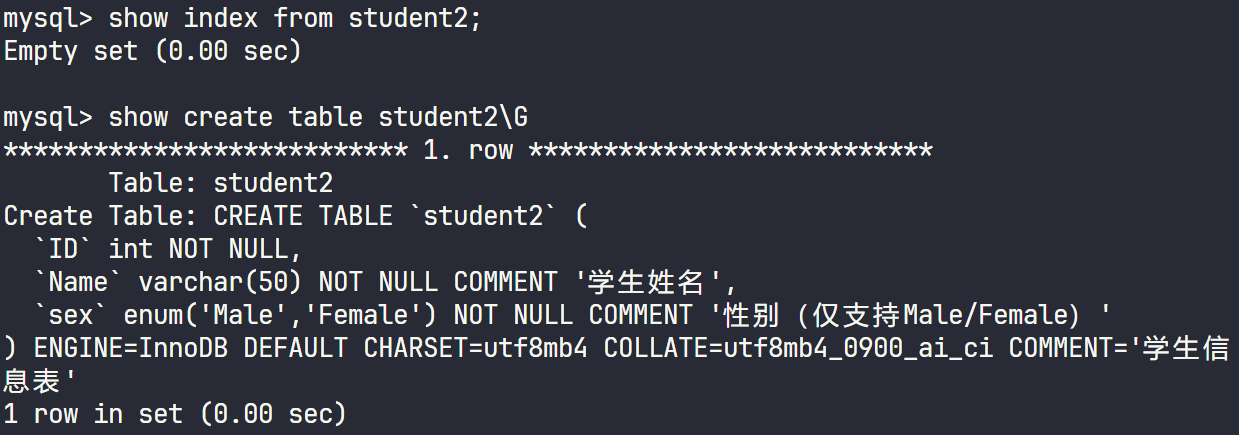 mysql> show create table student\G *************************** 1. row ***************************Table: student Create Table: CREATE TABLE `student` (`ID` int NOT NULL,`Name` varchar(50) NOT NULL COMMENT '学生姓名',`sex` enum('Male','Female') NOT NULL COMMENT '性别(仅支持Male/Female)' ) ENGINE=InnoDB DEFAULT CHARSET=utf8mb4 COLLATE=utf8mb4_0900_ai_ci COMMENT='学生信息表' -
