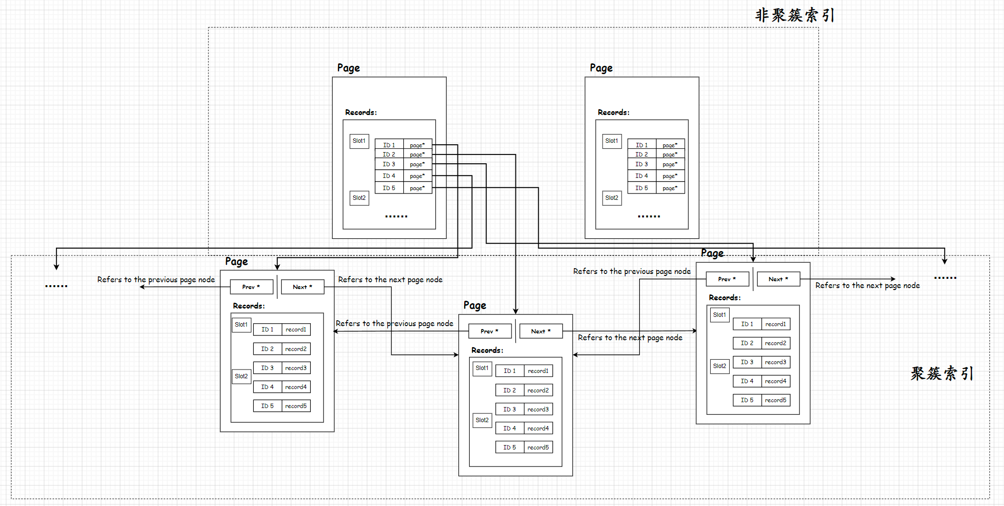 反观InnoDB存储引擎, 其采用了聚簇索引与非聚簇索引的合并, 分为聚簇索引和二级索引, 其中聚簇索引为优先级最高的索引方式, 而二级索引则为聚簇索引以外的索引方式;