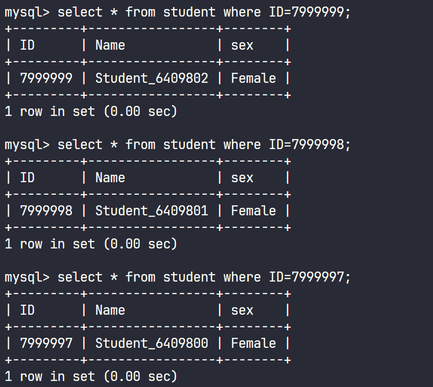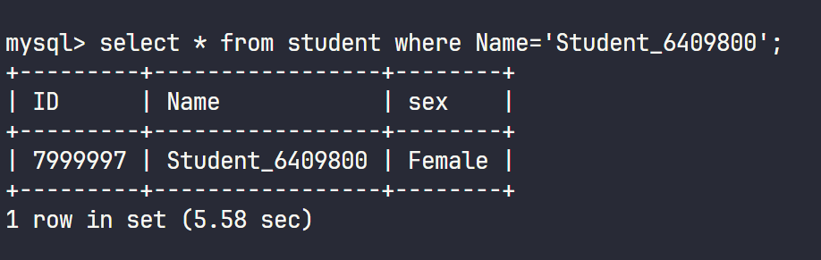 1 row in set (5.94 sec)mysql> select * from student where ID=7999999;