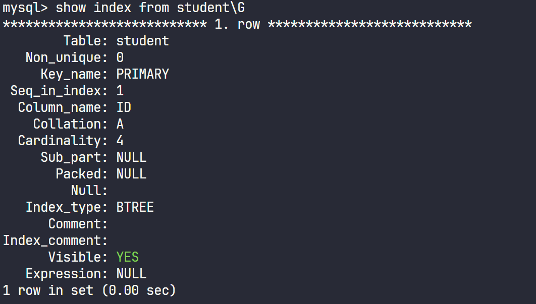 Key中看到具体某一列有索引, 使用该方式所展示数来的信息较为简短, 但同样可以观察到索引的信息;