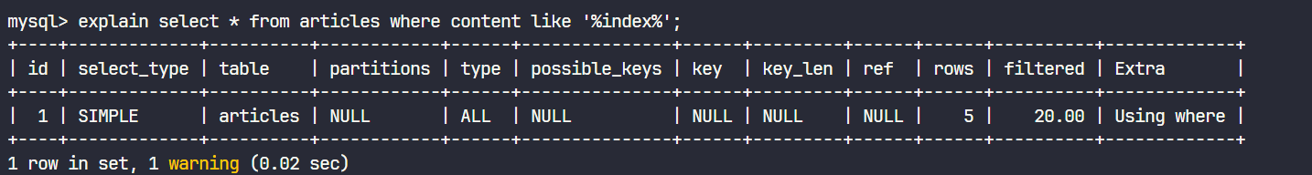 但是这种情况我们并没有使用到所谓的全文索引, 可以通过explain来查看该语句是否用到索引;