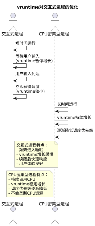 对于交互式应用,vruntime机制提供了天然的优化。交互式进程通常会在短时间内主动放弃CPU(如等待用户输入),期间vruntime不增长。当它们准备好运行时,由于vruntime相对较小,能够快速获得CPU时间。