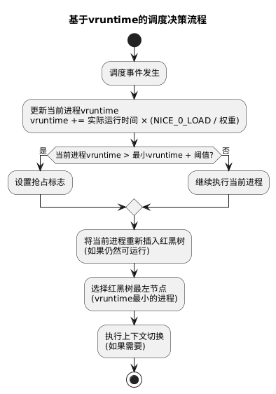 基于vruntime的调度决策遵循一个简单而有效的原则:总是选择vruntime最小的进程运行。这个原则确保了所有进程在长期运行中都能获得公平的CPU时间份额。