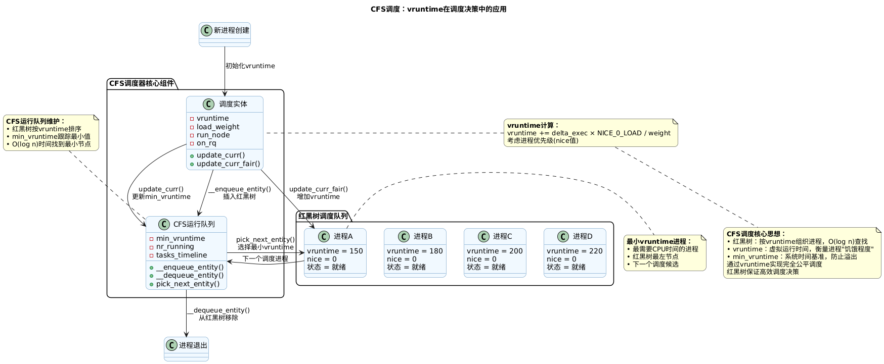 Linux完全公平调度器(CFS)通过引入虚拟运行时间(vruntime) 这一创新概念,优雅地解决了这个难题。vruntime不仅是CFS调度算法的核心,更是实现真正公平调度的关键所在。理解vruntime的工作原理,就等于掌握了CFS调度器的精髓。