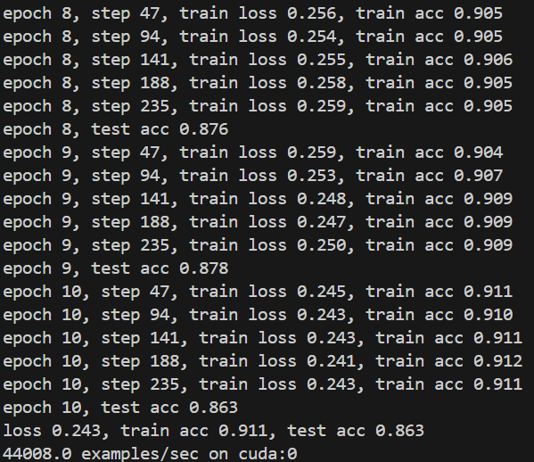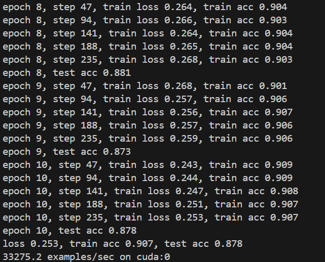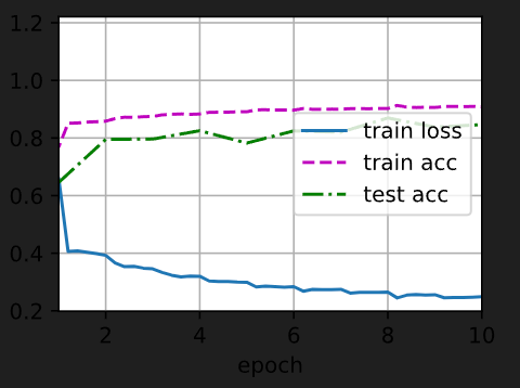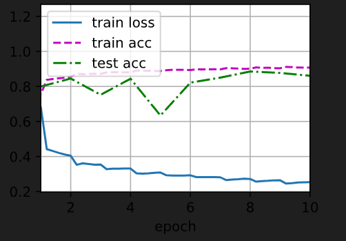 )if __name__ == '__main__':lr, num_epochs, batch_size = 1.0, 10, 256train_iter, test_iter = d2l.load_data_fashion_mnist(batch_size)train_ch6(net, train_iter, test_iter, num_epochs, lr, d2l.try_gpu())