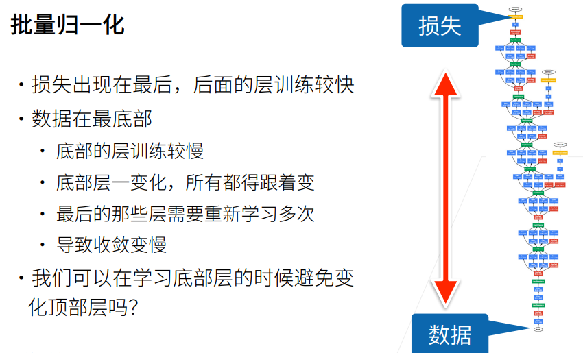 - 当每一个层的均值和方差都固定后,学习率太大的话,靠近loss上面的梯度太大,就梯度爆炸了,学习率太小的话,靠近数据的梯度太小了,就算不动(梯度消失)。
