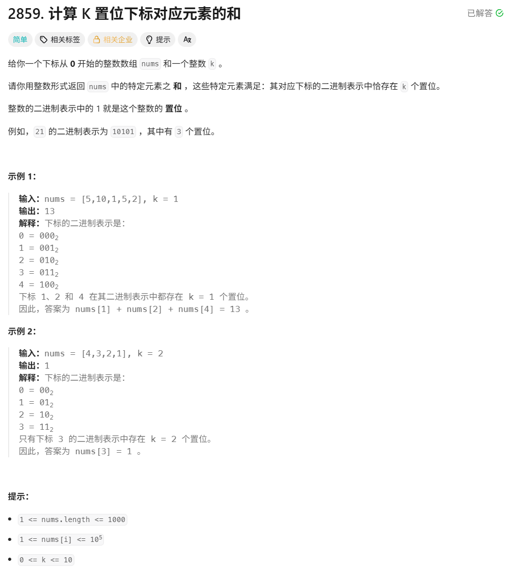 };这是我本人的思路,通过十进制转二进制的方法,通过每一次将索引除以二,看余数是否为1,是则让cnt++,否则不变,然后继续用除以二得到的商重复以上操作,直到商等于0,然后比较cnt和k,如果相等则符合条件,加到sum里面,最终遍历完每一个索引以后,返回sum的值。