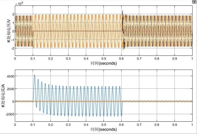 (3)t0.1s时K处发生三相短路接地故障,为永久性故障。同上,记录相关波形。