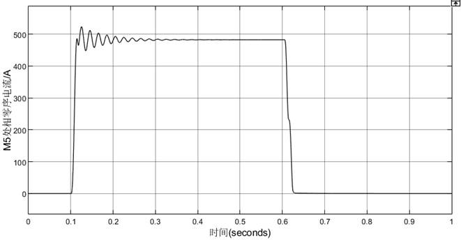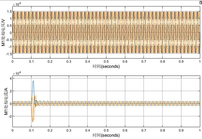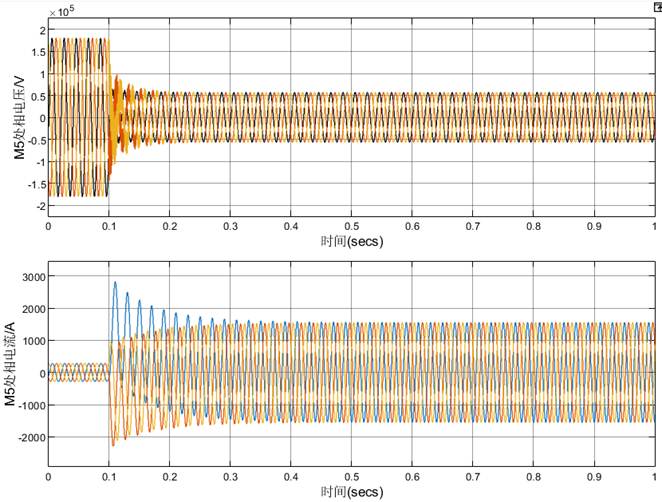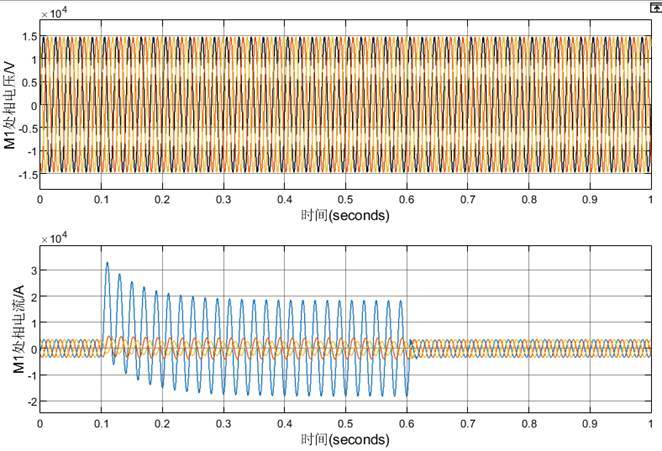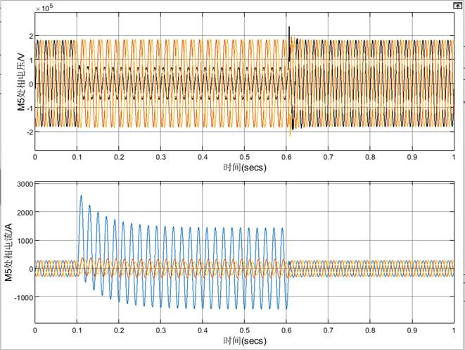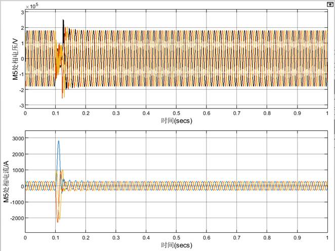 (2)t=0.1s时K处发生A相短路接地故障,持续0.5秒后故障消失。记录M1、M5处相电压、相电流的波形。