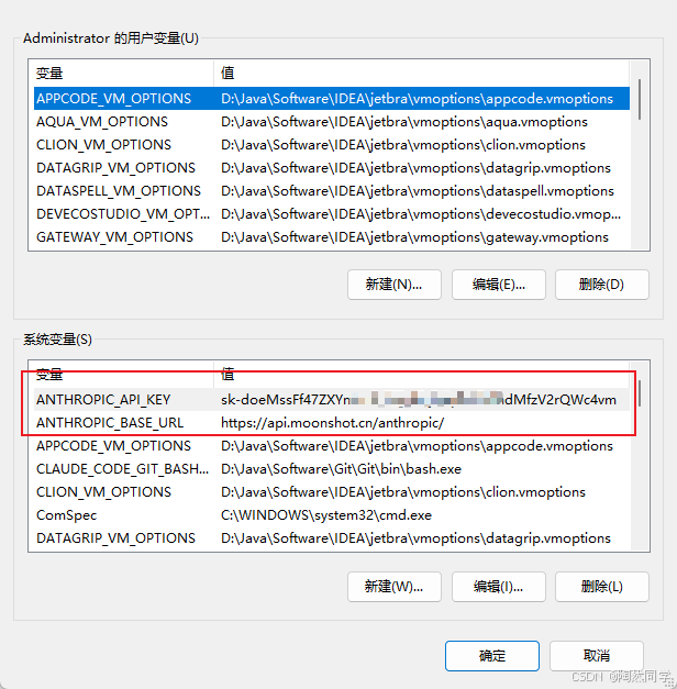 接下来将Moonshot的url以及API key设置进环境变量的系统变量中。