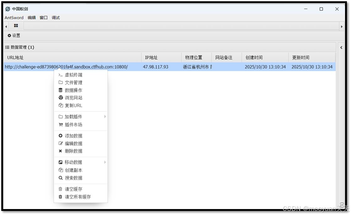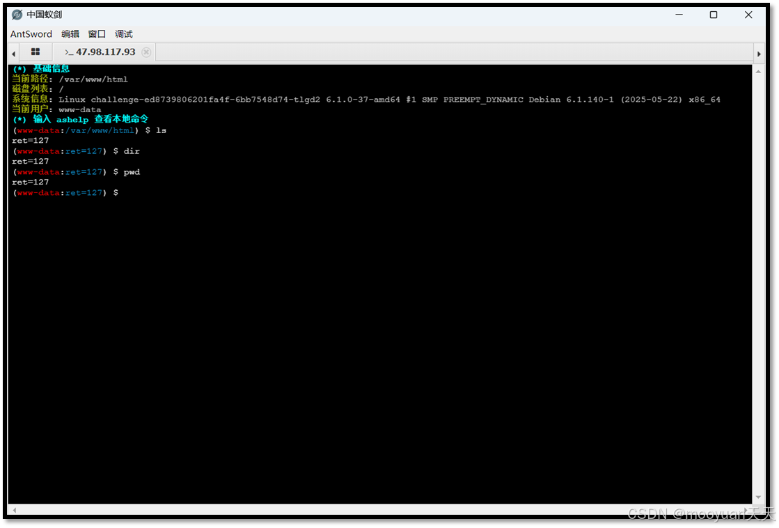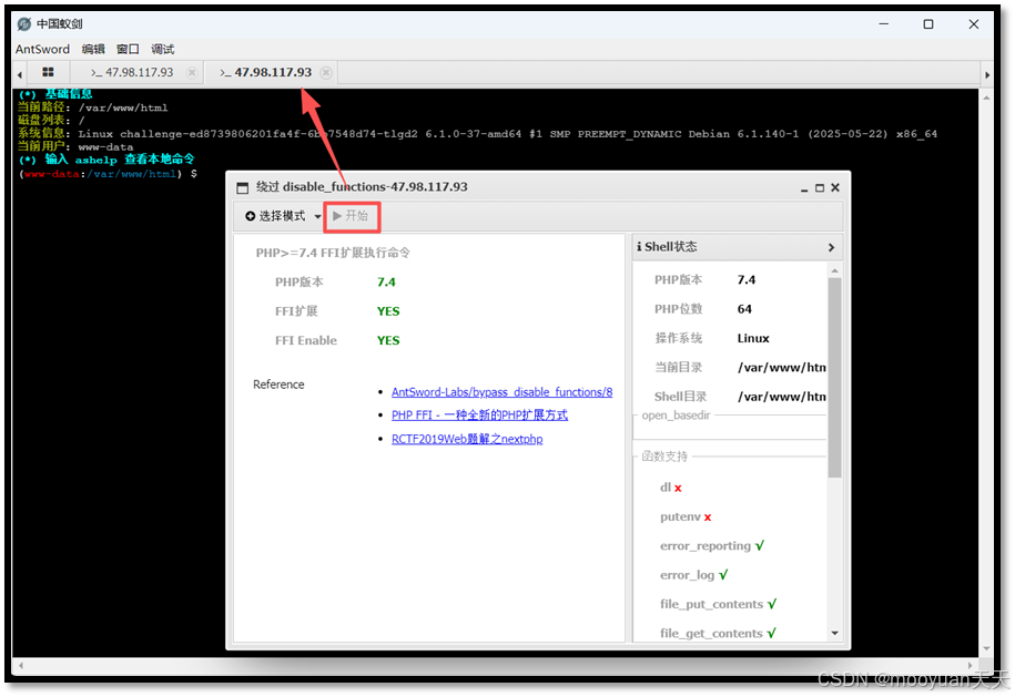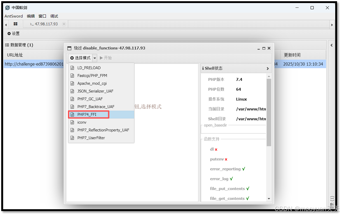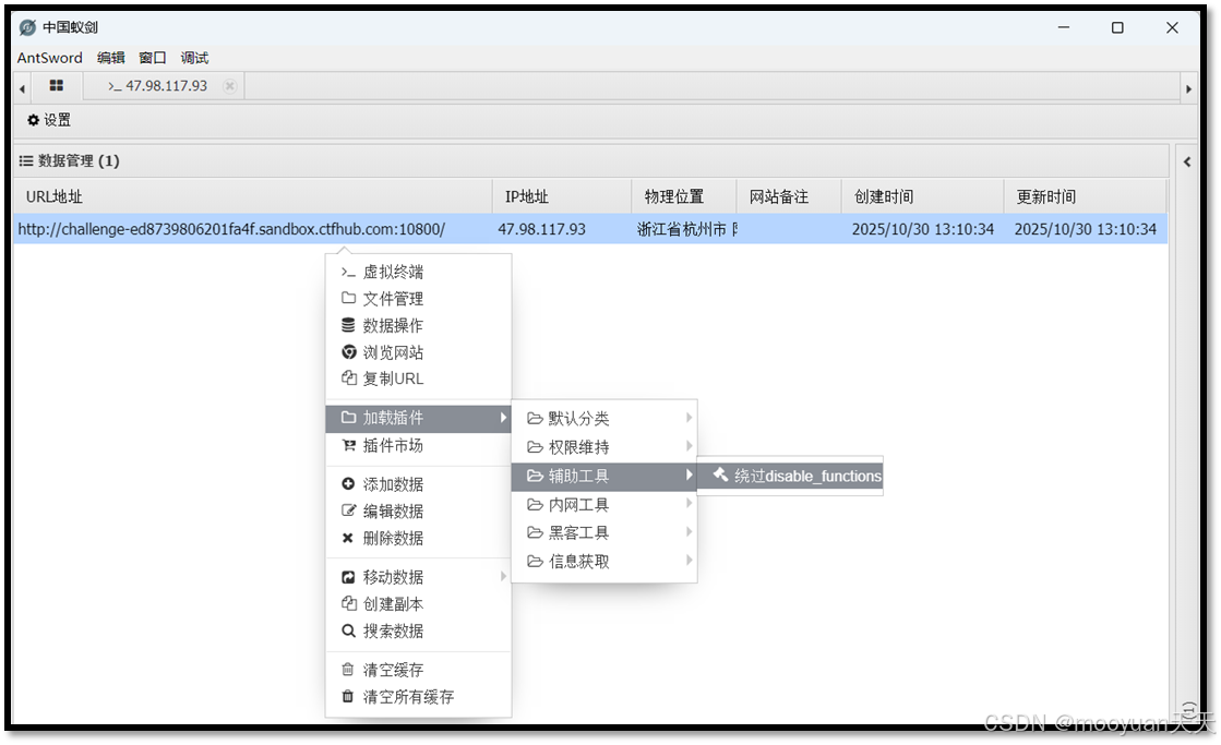 我们通过蚁剑工具的disable function插件绕过服务器的限制,具体操作步骤如下所示。