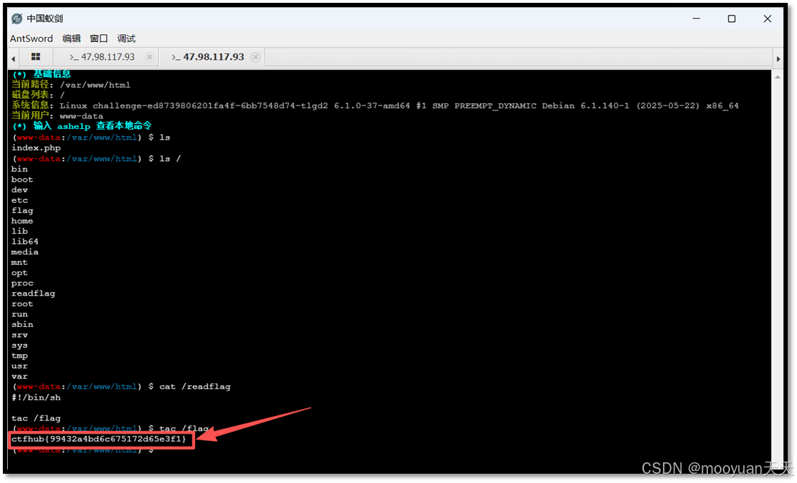 在新弹出的虚拟终端页面执行ls /命令列出根目录下所有文件,然后通过cat /readflag获取读flag文件的命令,最后通过tac /flag获得flag,如下所示。