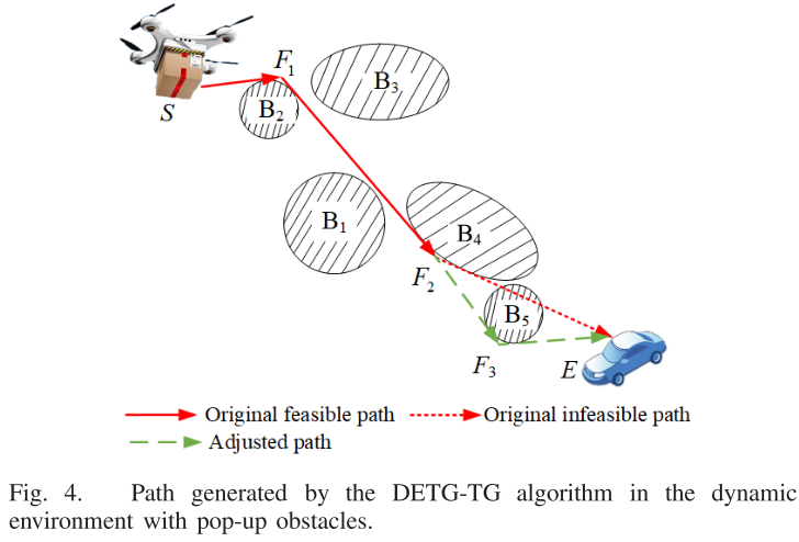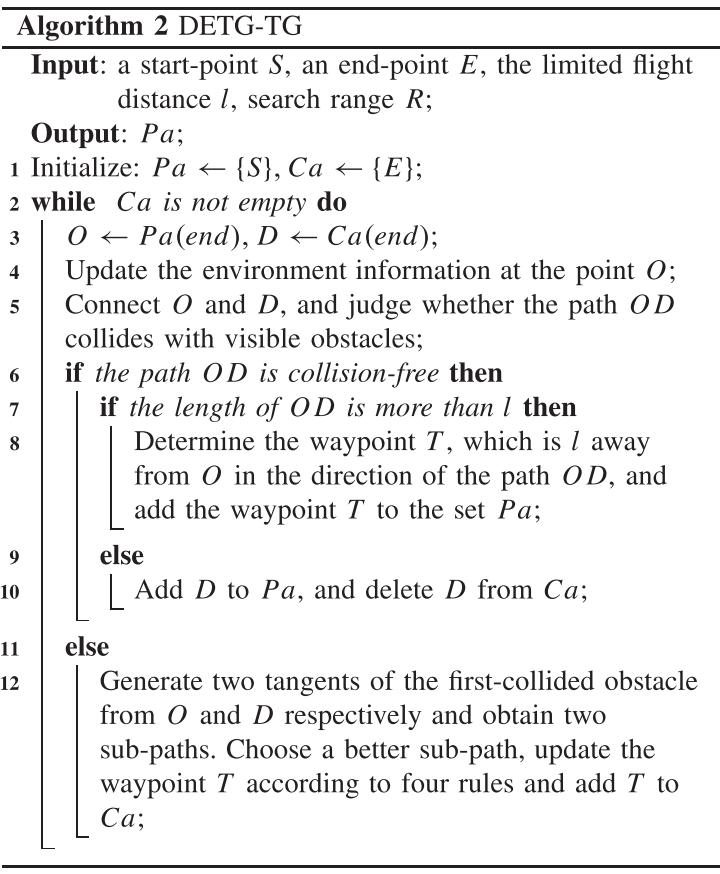 DETG-TG算法适用于动态环境和完全未知环境。在动态环境中,算法通过实时感知和重新规划碰撞路径应对突发障碍物;在未知环境中,算法通过传感器逐步感知并更新环境信息,限制飞行距离以频繁调整路径。算法通过迭代步骤,生成无碰撞路径并避开障碍,直至无人机到达终点。