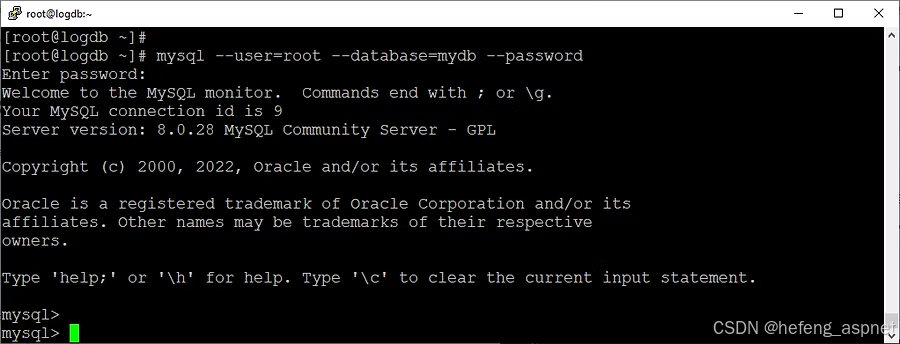 $ mysql --user=root --database=mydb --password