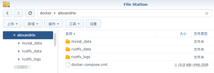 mkdir -p /volume1/docker/alexandrie/{mysql_data,rustfs_data,rustfs_logs}# 进入 alexandrie 目录