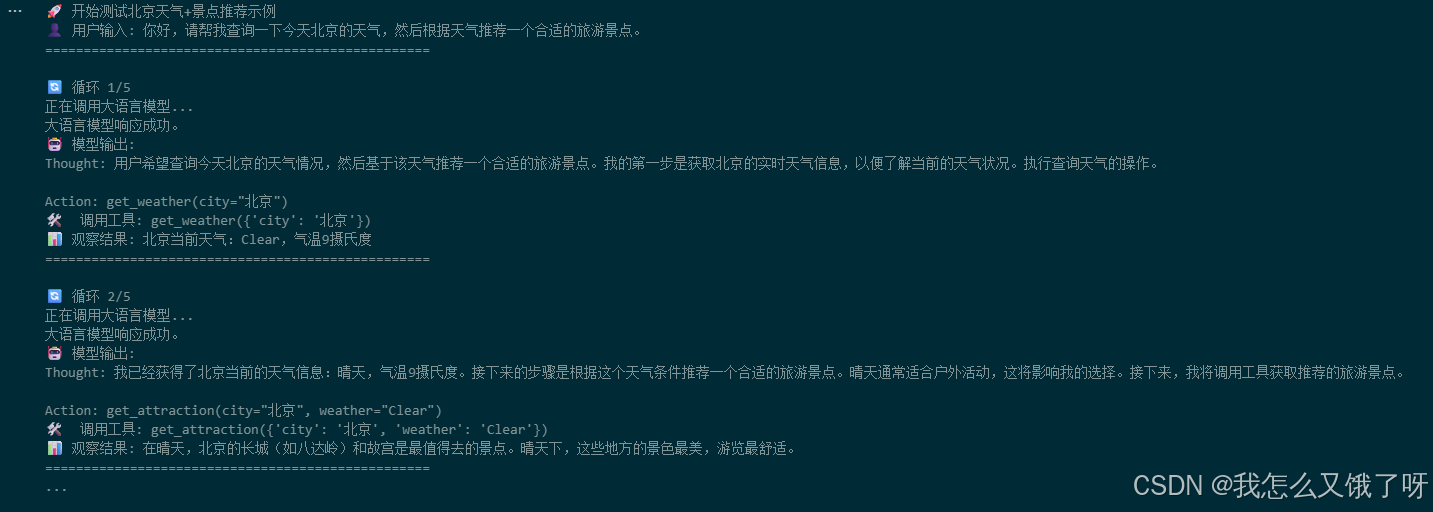 for i in range(5): # 设置最大循环次数print(f"--- 循环 {i+1} ---\n")# 3.1. 构建Promptfull_prompt = "\n".join(prompt_history)# 3.2. 调用LLM进行思考llm_output = llm.generate(full_prompt, system_prompt=AGENT_SYSTEM_PROMPT)# 模型可能会输出多余的Thought-Action,需要截断match = re.search(r'(Thought:.*?Action:.*?)(?=\n\s*(?:Thought:|Action:|Observation:)|\Z)', llm_output, re.DOTALL)if match:truncated = match.group(1).strip()if truncated != llm_output.strip():llm_output = truncatedprint("已截断多余的 Thought-Action 对")print(f"模型输出:\n{llm_output}\n")prompt_history.append(llm_output)# 3.3. 解析并执行行动action_match = re.search(r"Action: (.*)", llm_output, re.DOTALL)if not action_match:print("解析错误:模型输出中未找到 Action。")breakaction_str = action_match.group(1).strip()if action_str.startswith("finish"):final_answer = re.search(r'finish\(answer="(.*)"\)', action_str).group(1)print(f"任务完成,最终答案: {final_answer}")breaktool_name = re.search(r"(\w+)\(", action_str).group(1)args_str = re.search(r"\((.*)\)", action_str).group(1)kwargs = dict(re.findall(r'(\w+)="([^"]*)"', args_str))if tool_name in available_tools:observation = available_tools[tool_name](**kwargs)else:observation = f"错误:未定义的工具 '{tool_name}'"# 3.4. 记录观察结果observation_str = f"Observation: {observation}"print(f"{observation_str}\n" + "="*40)prompt_history.append(observation_str)