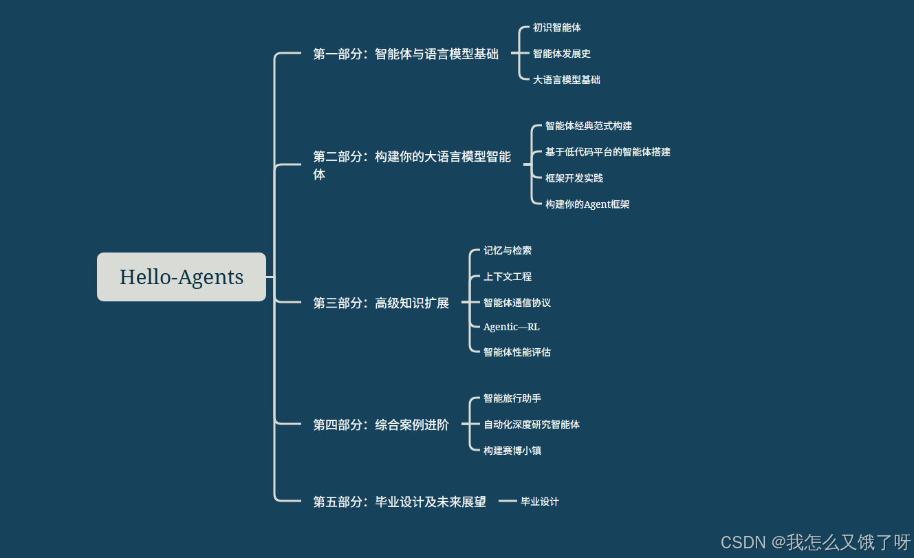 2025 年被视为“Agent 元年”,多智能体协同(MAS)成为释放大模型潜能、解决真实复杂问题的关键。然而,网上我们可见的框架纷飞,能够进行系统学习的材料却非常稀缺,此次Hello-Agents 就可以作为链接初学者入门的桥梁,用第一性原理+实战,把开发者从“调 API 的用户”可自行模拟场景的创造者,带大家从零搭出属于自己的多智能体应用。简单来说,会聊天的大模型像装满知识的“大脑”,而 Agent 就是给大脑装上“手脚”和“团队”,让它能自己接单、查资料、写代码、互相讨论,把活干完。学 Agent 别急着追新框架,先弄懂“大脑怎么想、手脚怎么动、队员怎么配合”这三件事,再结合本教程中的一些小项目练手,一点点把流程跑通,即可食用(*╹▽╹*)。。。