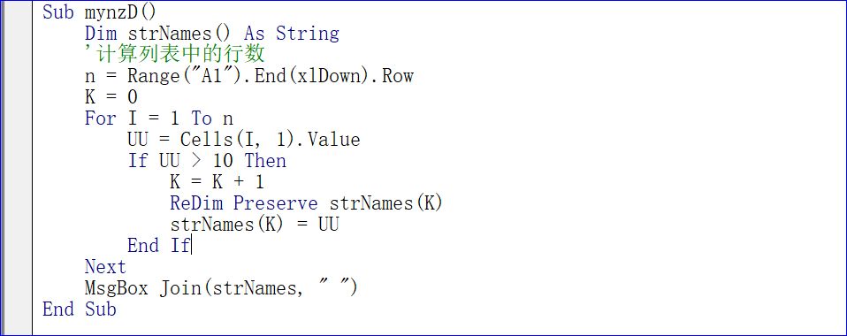 1)上述代码中利用ReDim Preserve strNames(K)来增加动态数组的分配个数,分配的时候保留原数据。由于增加数组分配个数是在判断了值大于10之后的动作,从而保证了数据的严谨。