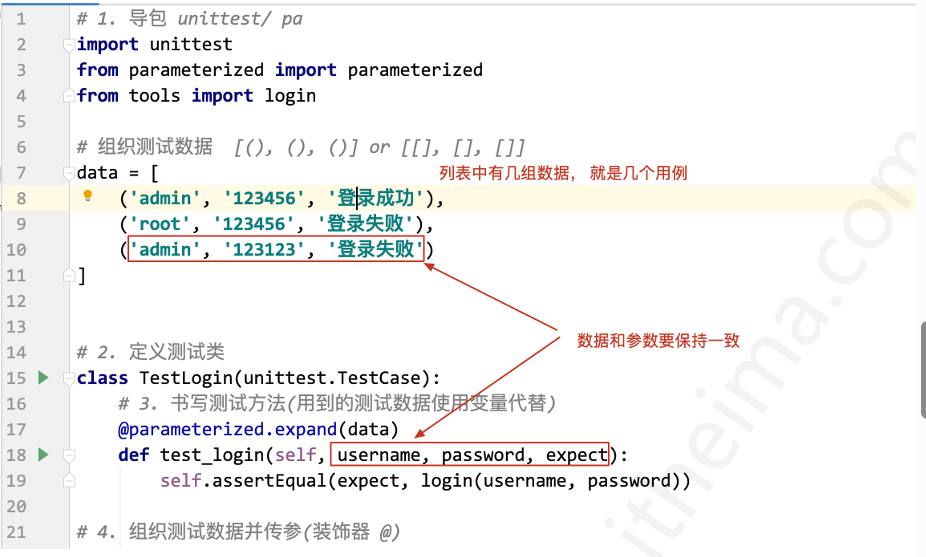 参数化:在测试方法中, 使用变量来代替具体的测试数据, 然后使用传参的方法将测试数据传递给方法的变量