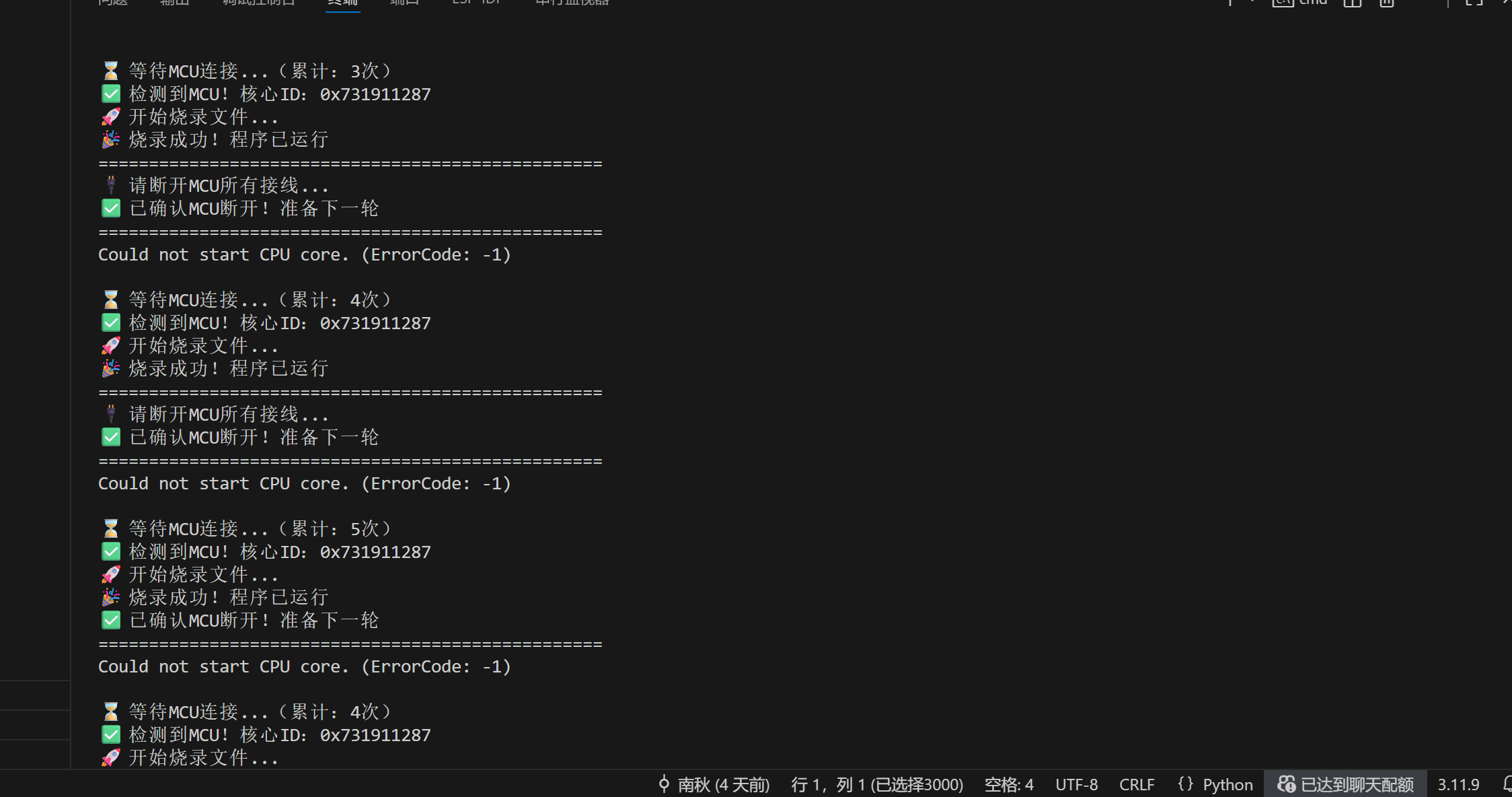 # ===================================================def auto_burn_mcu():jlink = pylink.JLink()burn_count = 0print("="*50)print("🚀 自动烧录程序启动(核心ID=-1视为未连接)")print(f"📌 配置:MCU={MCU} | 间隔={POLL_INTERVAL}秒 | 累计烧录:{burn_count}次")print("💡 操作:连接MCU→自动烧录→断开接线→等下一轮")print("="*50)try:while True:# 每次循环重置J-Link,避免前次异常残留if jlink.opened():jlink.close()jlink.open(serial_no=JLINK_SERIAL)jlink.set_tif(pylink.enums.JLinkInterfaces.SWD)try:print(f"\n⌛ 等待MCU连接...(累计:{burn_count}次)")connect_result = jlink.connect(MCU, verbose=False)core_id = jlink.core_id() if jlink.connected else "-1"# 关键判断:核心ID=-1 或 未连接 → 视为没接上,重新等待if core_id == -1 or not jlink.connected:print(f"⚠️ 未检测到有效MCU(核心ID:0x{core_id}),{POLL_INTERVAL}秒后重试")time.sleep(POLL_INTERVAL)continue# 走到这步=真正连接成功print(f"✅ 检测到MCU!核心ID:0x{core_id}")print(f"🚀 开始烧录文件...")# 烧录前确保CPU暂停,避免冲突jlink.halt()jlink.flash_file(DOWNLOAD_FILE, FLASH_START_ADDR)jlink.reset()jlink.power_on() # 正确启动程序# 计数更新burn_count += 1print("🎉 烧录成功!程序已运行")print("="*50)# 等待断开(读取核心ID,-1即视为断开)print("🔌 请断开MCU所有接线...")while True:try:current_id = jlink.core_id()if current_id == -1:print("✅ 已确认MCU断开!准备下一轮")print("="*50)breaktime.sleep(1)except pylink.JLinkException:# 读取失败也视为断开print("✅ 已确认MCU断开!准备下一轮")print("="*50)breakexcept pylink.JLinkException as e:print(f"⚠️ 连接异常:{str(e)[:30]}...,{POLL_INTERVAL}秒后重试")time.sleep(POLL_INTERVAL)except Exception as e:print(f"\n❌ 操作异常:{str(e)}")print("💡 排查:接线是否牢固 | MCU供电是否稳定")print("="*50)time.sleep(POLL_INTERVAL)except KeyboardInterrupt:print(f"\n\n🛑 程序终止")print(f"📊 本次烧录:{burn_count}次")finally:jlink.close()print("🔌 J-Link已断开,程序退出")if __name__ == "__main__":auto_burn_mcu()