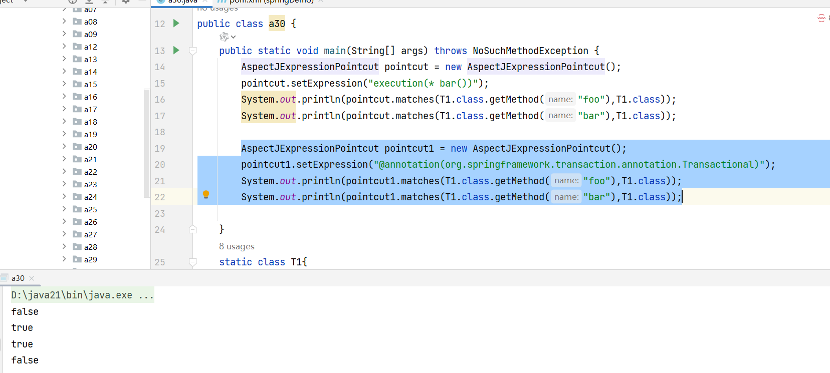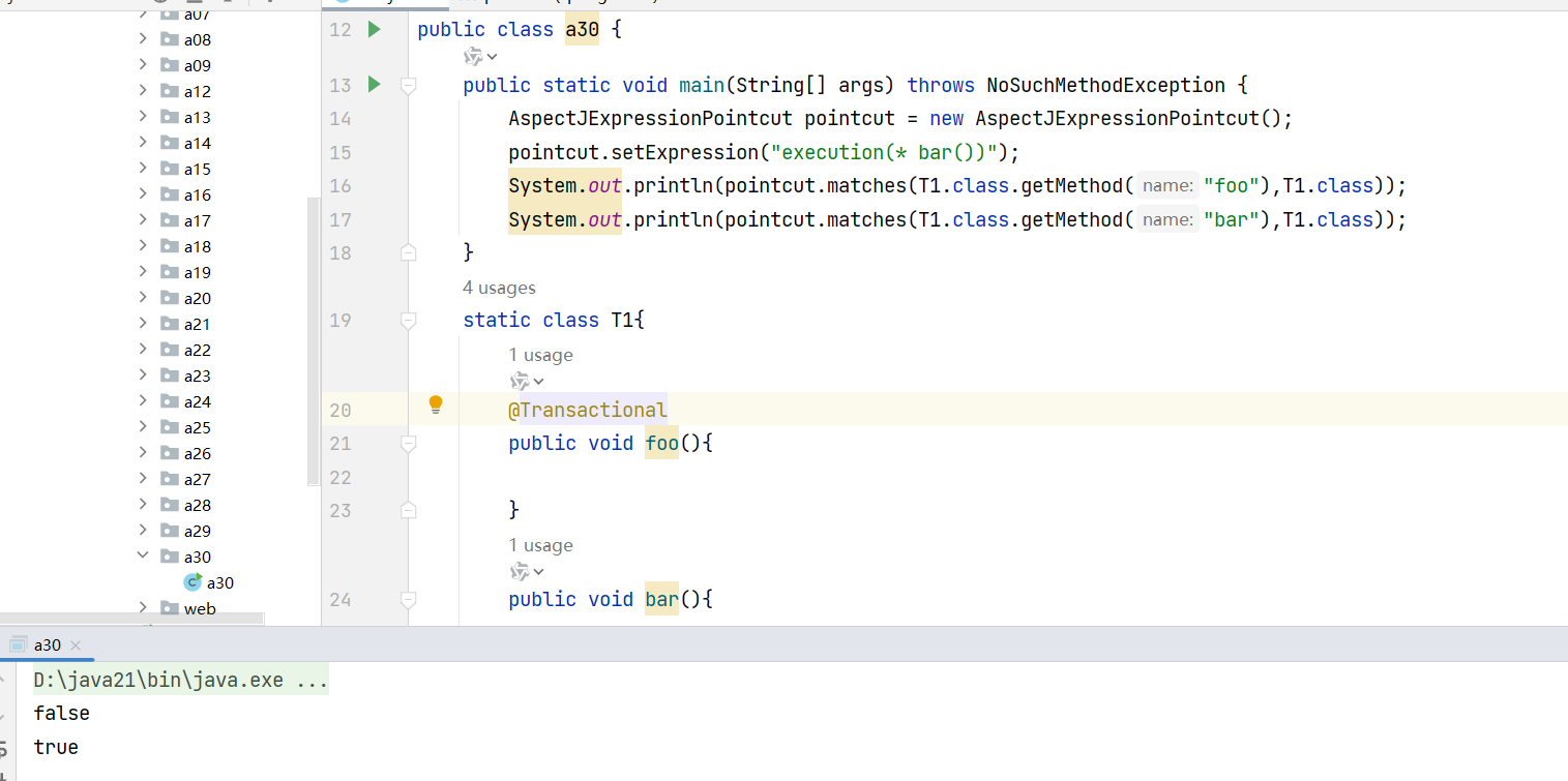 public class a30 {public static void main(String[] args) throws NoSuchMethodException {AspectJExpressionPointcut pointcut = new AspectJExpressionPointcut();pointcut.setExpression("execution(* bar())");System.out.println(pointcut.matches(T1.class.getMethod("foo"),T1.class));System.out.println(pointcut.matches(T1.class.getMethod("bar"),T1.class));}static class T1{@Transactionalpublic void foo(){}public void bar(){}}