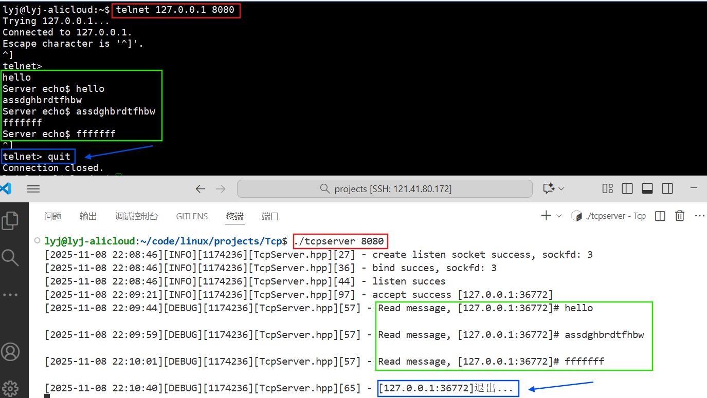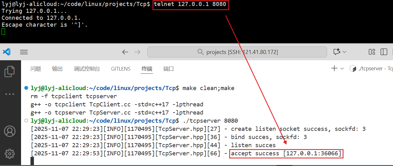 {if (argc != 2){Usage(argv[0]);exit(ExitCode::USAGE_ERR);}uint16_t port = std::stoi(argv[1]);LogToConsole();std::unique_ptr<TcpServer> tcp_server = std::make_unique<TcpServer>(port);tcp_server->Init();while(1); // 先让程序不退出return 0;