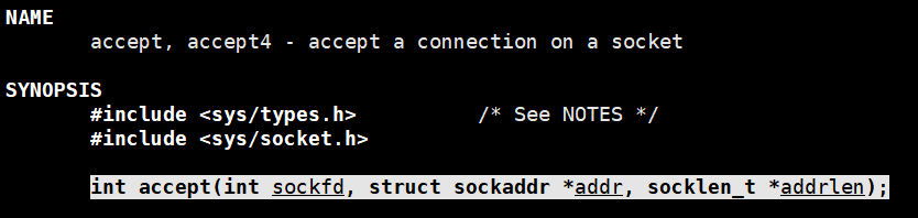 accept函数获取链接。这个函数的后两个参数其实等同于recvfrom函数后两个参数,是输出型参数。获取链接时要知道是谁连接的你。
