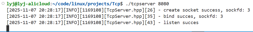 public:TcpServer(uint16_t port): _port(port),_listen_sockfd(-1),_isrunning(false){}void Init(){// 1.创建套接字_listen_sockfd = socket(AF_INET, SOCK_STREAM, 0);if (_listen_sockfd < 0){LOG(LogLevel::FATAL) << "创建socket失败";exit(ExitCode::SOCKET_ERR);}LOG(LogLevel::INFO) << "create listen socket success, sockfd: " << _listen_sockfd;// 2.bindInetAddr local(_port);int n = bind(_listen_sockfd, local.NetAddrPtr(), local.NetAddrLen());if (n < 0){LOG(LogLevel::FATAL) << "bind 失败";exit(ExitCode::BIND_ERR);}LOG(LogLevel::INFO) << "bind succes, sockfd: " << _listen_sockfd;// 3.设置listen状态n = listen(_listen_sockfd, 8);if (n < 0){LOG(LogLevel::FATAL) << "listen 失败";exit(ExitCode::LISTEN_ERR);}LOG(LogLevel::INFO) << "listen succes";}void Run(){if(_isrunning) // 不能重复启动return;_isrunning = true;// 获取链接while(_isrunning){struct sockaddr_in peer;socklen_t len = sizeof(sockaddr_in);// 没有链接时,accept会被阻塞int sockfd = accept(_listen_sockfd, CONV(peer), &len);if(sockfd < 0){LOG(LogLevel::WARNING) << "accept error";continue;}InetAddr local(peer); // 这里需要网络转主机LOG(LogLevel::INFO) << "accept success " << local.StringAddr();}_isrunning = false;}~TcpServer() {}private:uint16_t _port; // 端口号int _listen_sockfd;bool _isrunning;