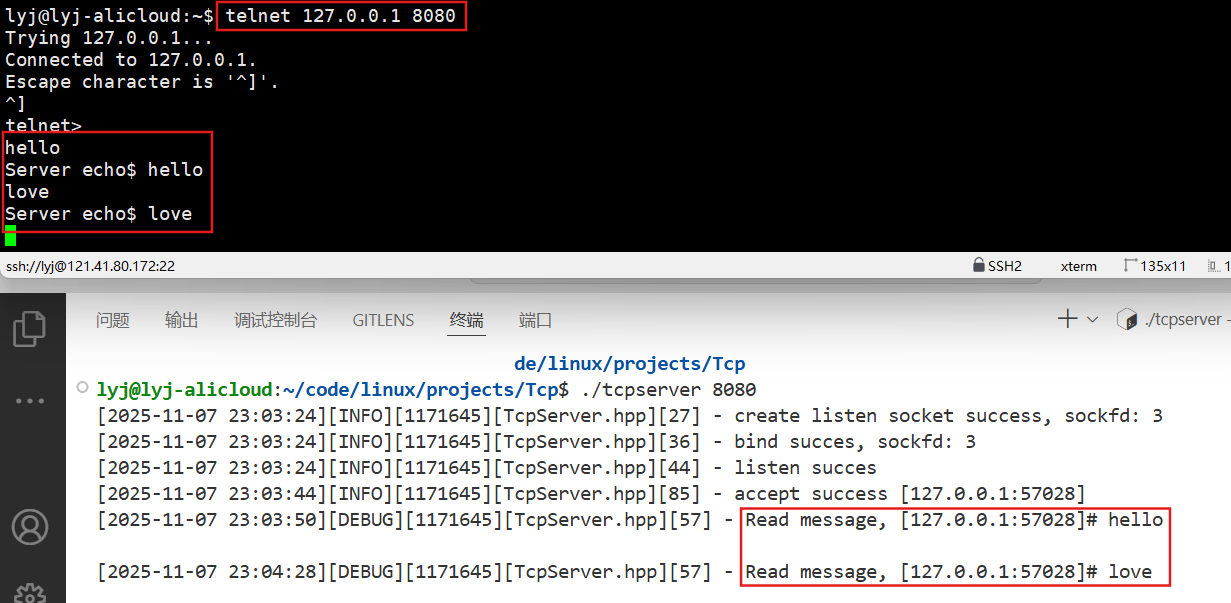 void Service(int sockfd, InetAddr &peer){char buffer[1024];while (true){// b.收消息ssize_t n = read(sockfd, buffer, sizeof(buffer) - 1);if (n > 0){buffer[n] = 0;LOG(LogLevel::DEBUG) << "Read message, " << peer.StringAddr() << "# " << buffer;// c.发消息std::string echo_string = "Server echo$ ";echo_string += buffer;write(sockfd, echo_string.c_str(), echo_string.size());}}}