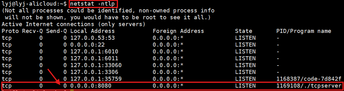 我们刚刚启动的TcpServer就是端口号为8080的这个,状态为listen状态。