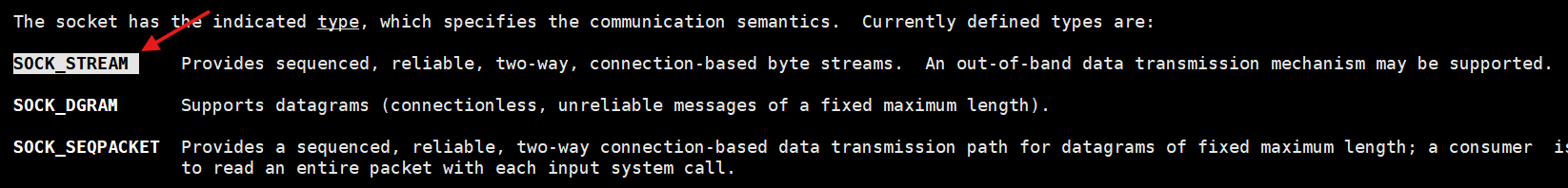 第一个参数是AF_INET;因为TCP面向字节流,所以第二个参数填SOCK_STREAM;第三个参数就填0。
